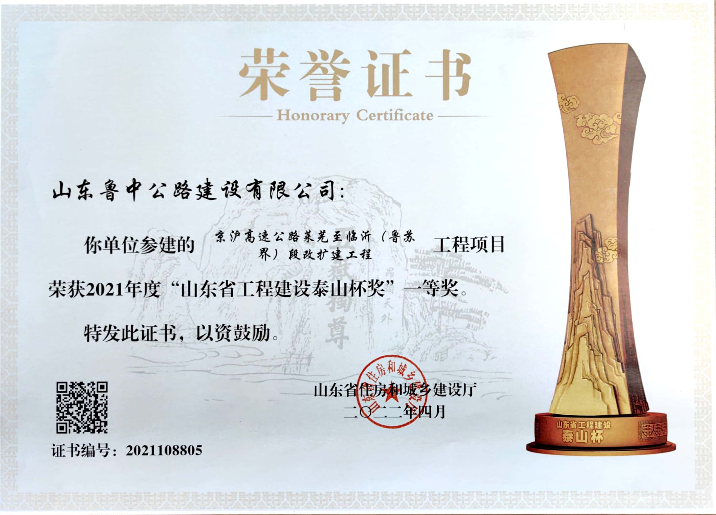 - 京滬高速公路萊蕪至臨沂(魯蘇界)段改擴(kuò)建工程榮獲2021年度“山東省工程建設(shè)泰山杯獎(jiǎng)“一等獎(jiǎng)”