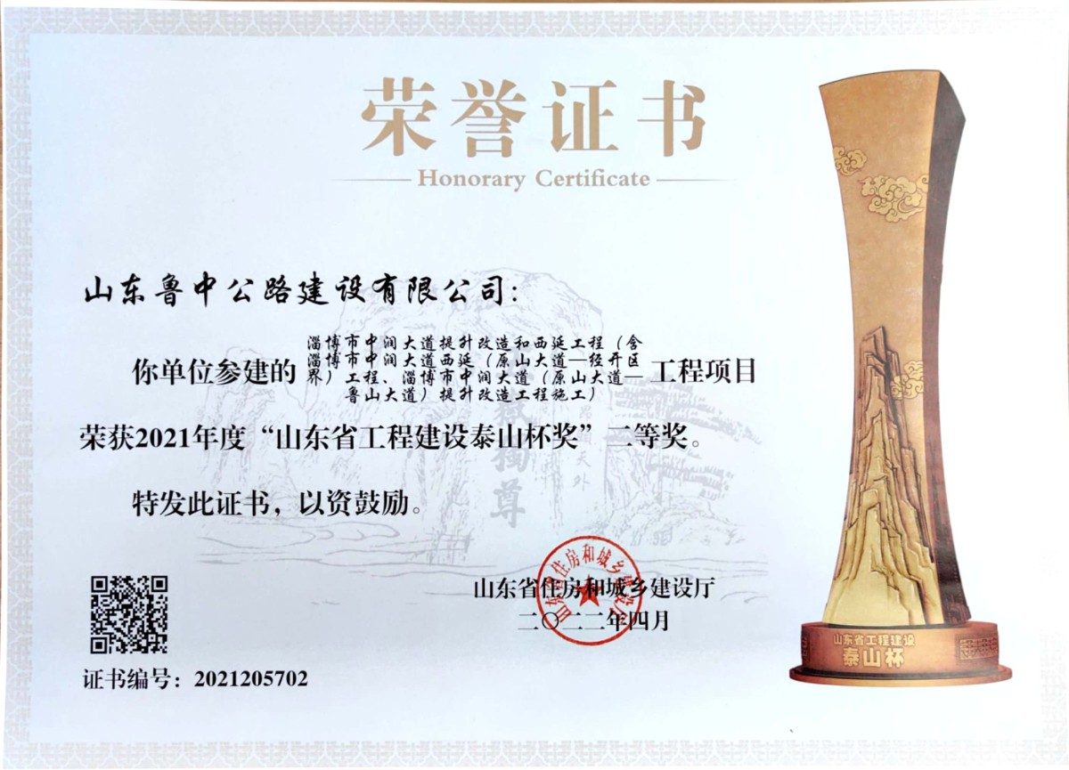 - 淄博市中潤(rùn)大道提升改造和西延工程榮獲2021年度”山東省工程建設(shè)泰山杯獎(jiǎng)“二等獎(jiǎng)