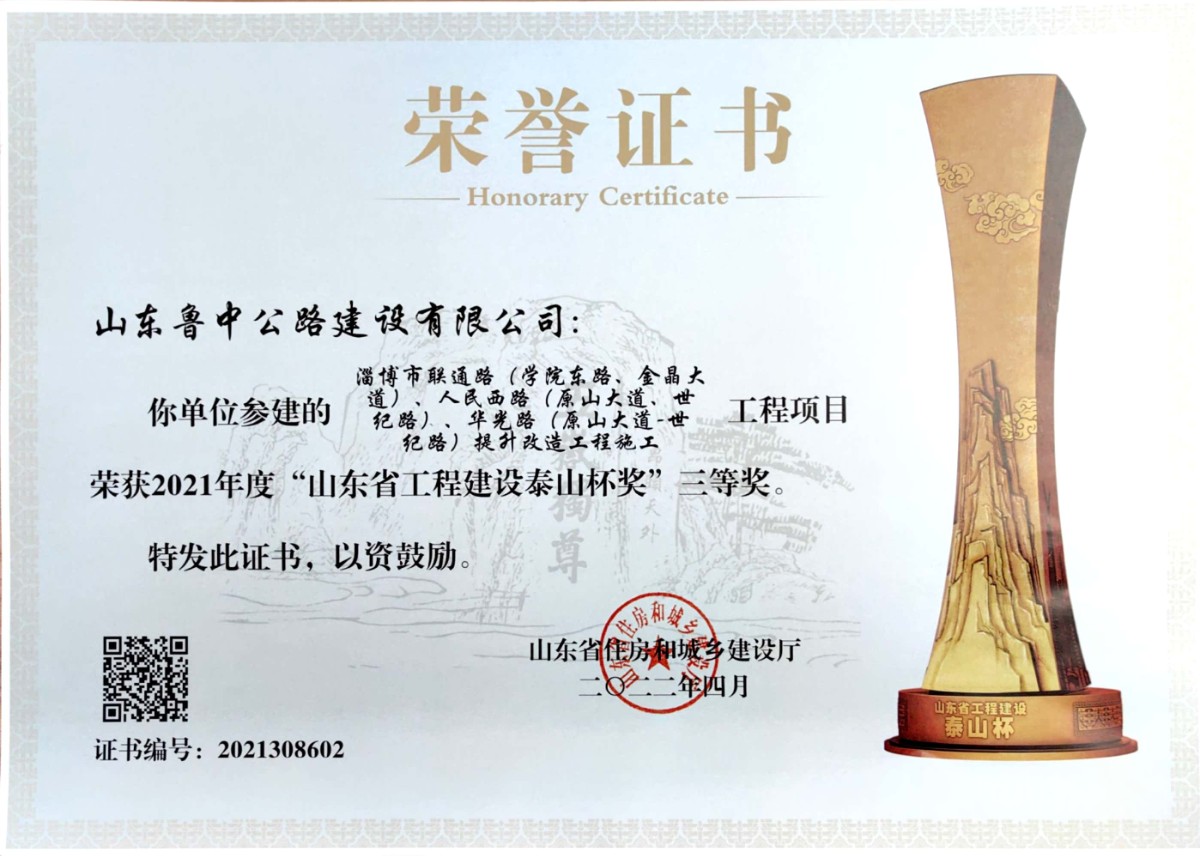 - 淄博市聯(lián)通路、人民西路、華光路提升改造工程榮獲2021年度”山東省工程建設(shè)泰山杯獎(jiǎng)“三等獎(jiǎng)