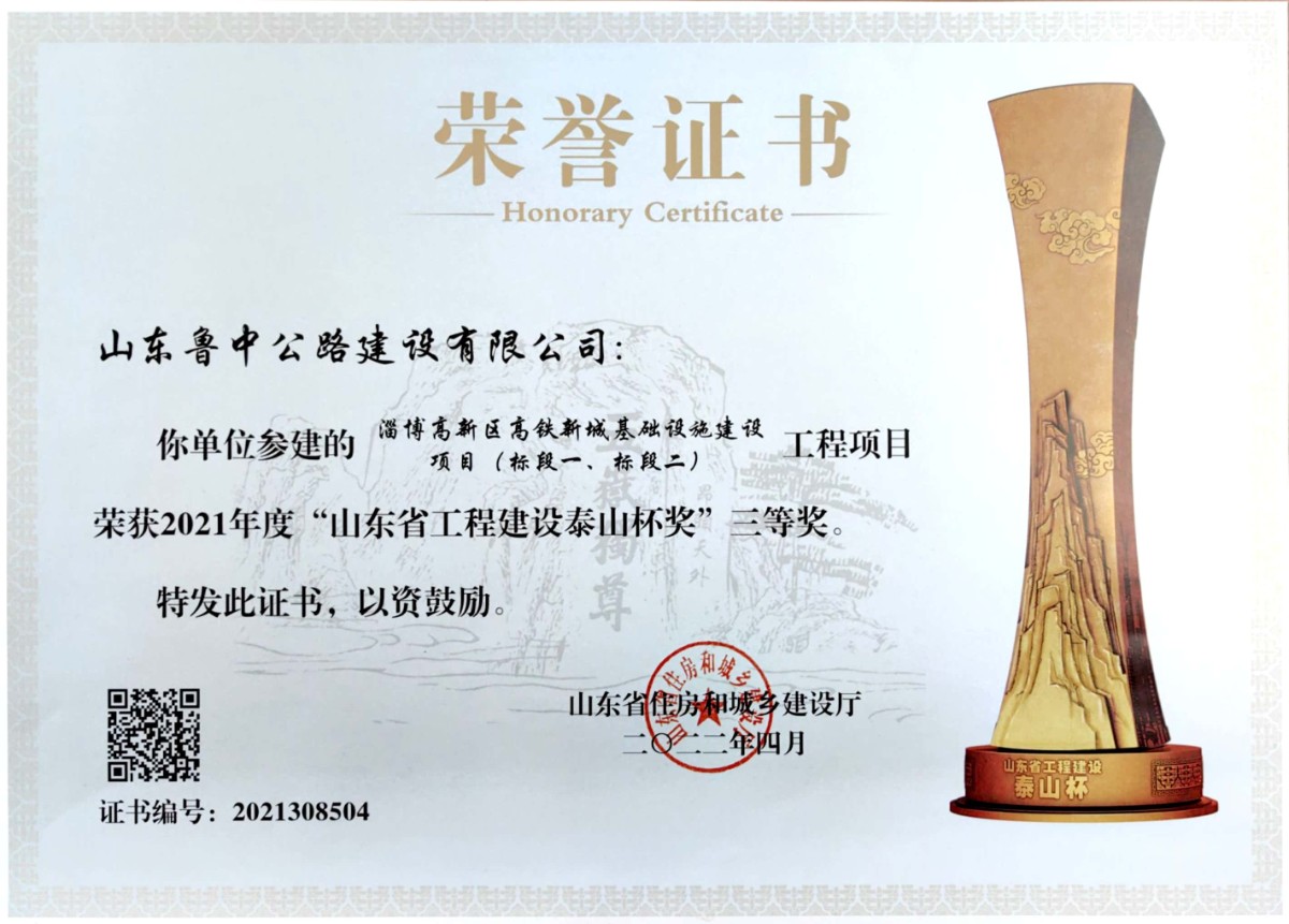 - 淄博高新區(qū)高鐵新城基礎(chǔ)設(shè)施建設(shè)項(xiàng)目榮獲2021年度”山東省工程建設(shè)泰山杯獎(jiǎng)“三等獎(jiǎng)