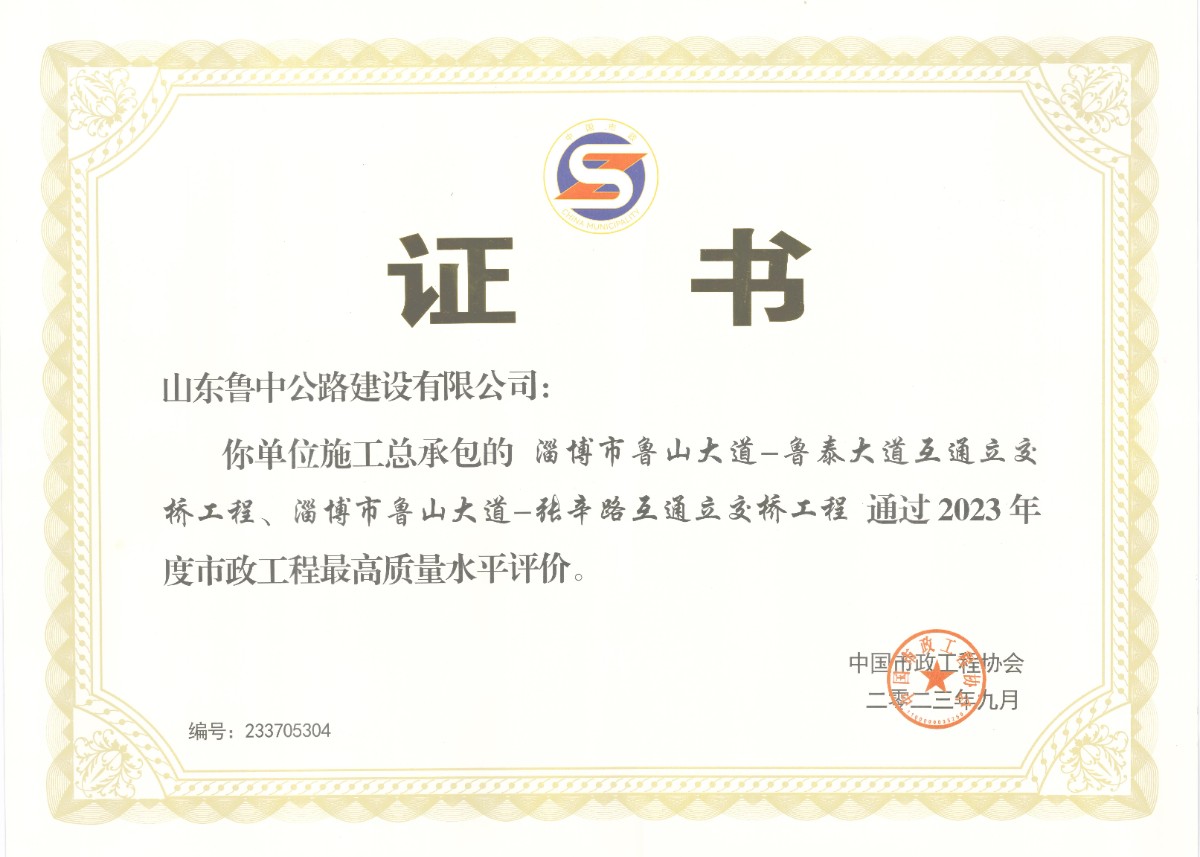 - 淄博市魯山大道-魯泰大道互通立交橋、魯山大道-張辛路互通立交橋工程獲2023年度市政工程最高質(zhì)量水平評(píng)價(jià)
