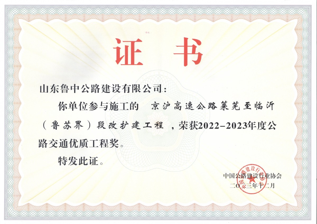 - 京滬高速公路萊蕪至臨沂(魯蘇界)段改擴(kuò)建工程榮獲2022-2023年度公路交通優(yōu)質(zhì)工程獎(jiǎng)