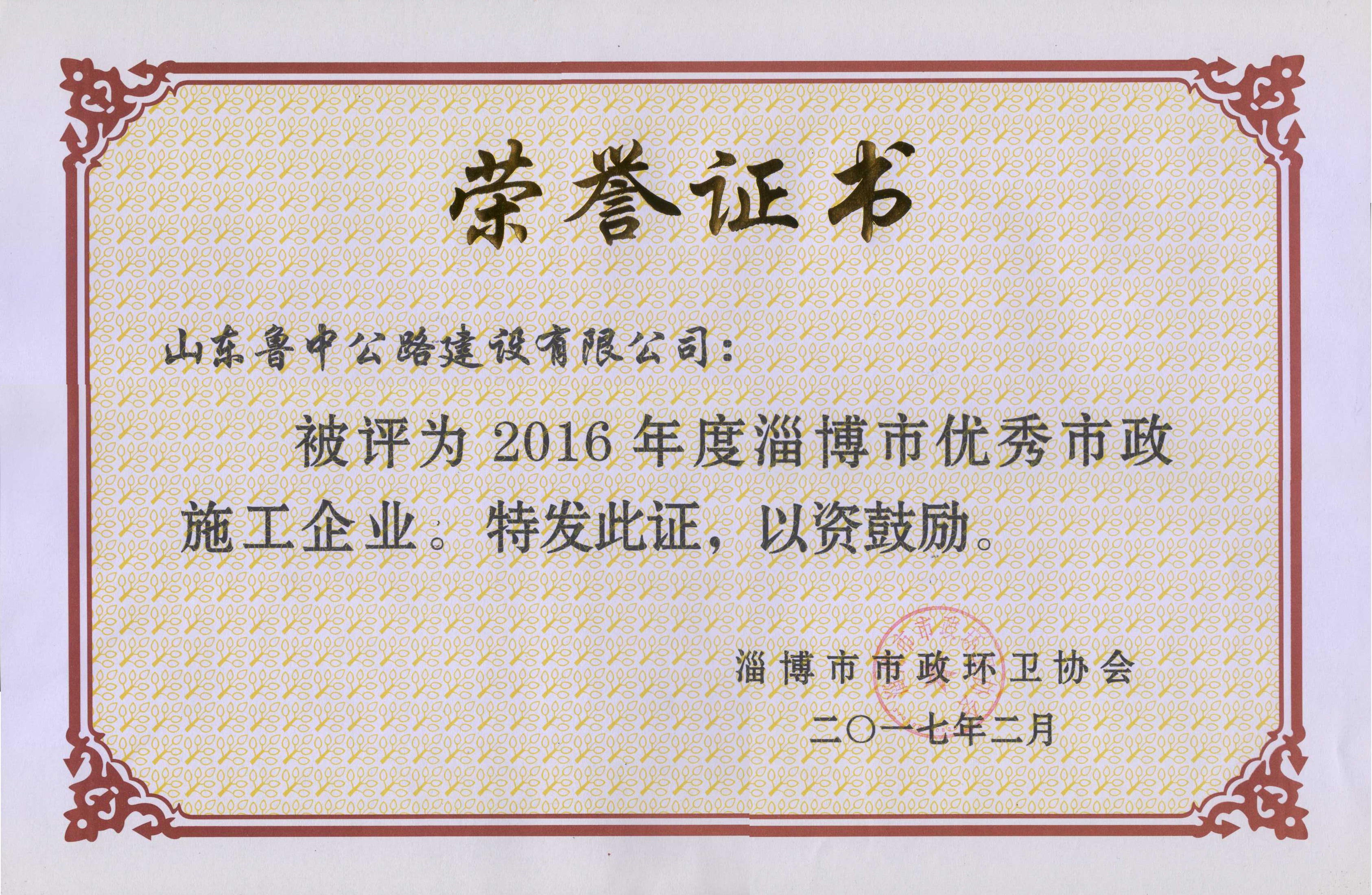 公司被評(píng)為2016年度淄博市優(yōu)秀市政施工企業(yè)