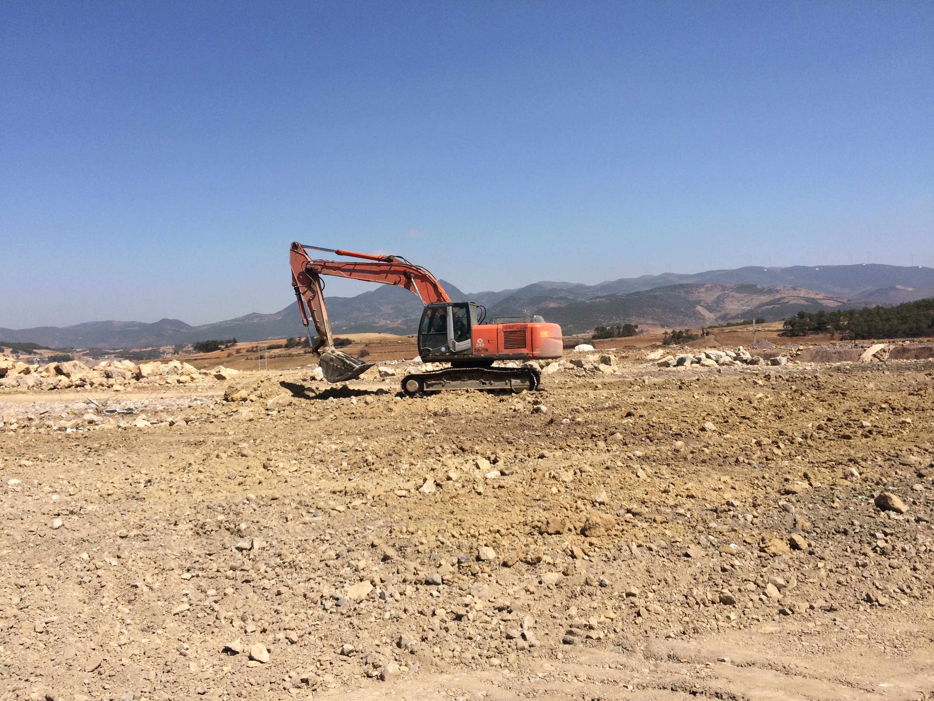 挖掘機在清理碎石、平整路面