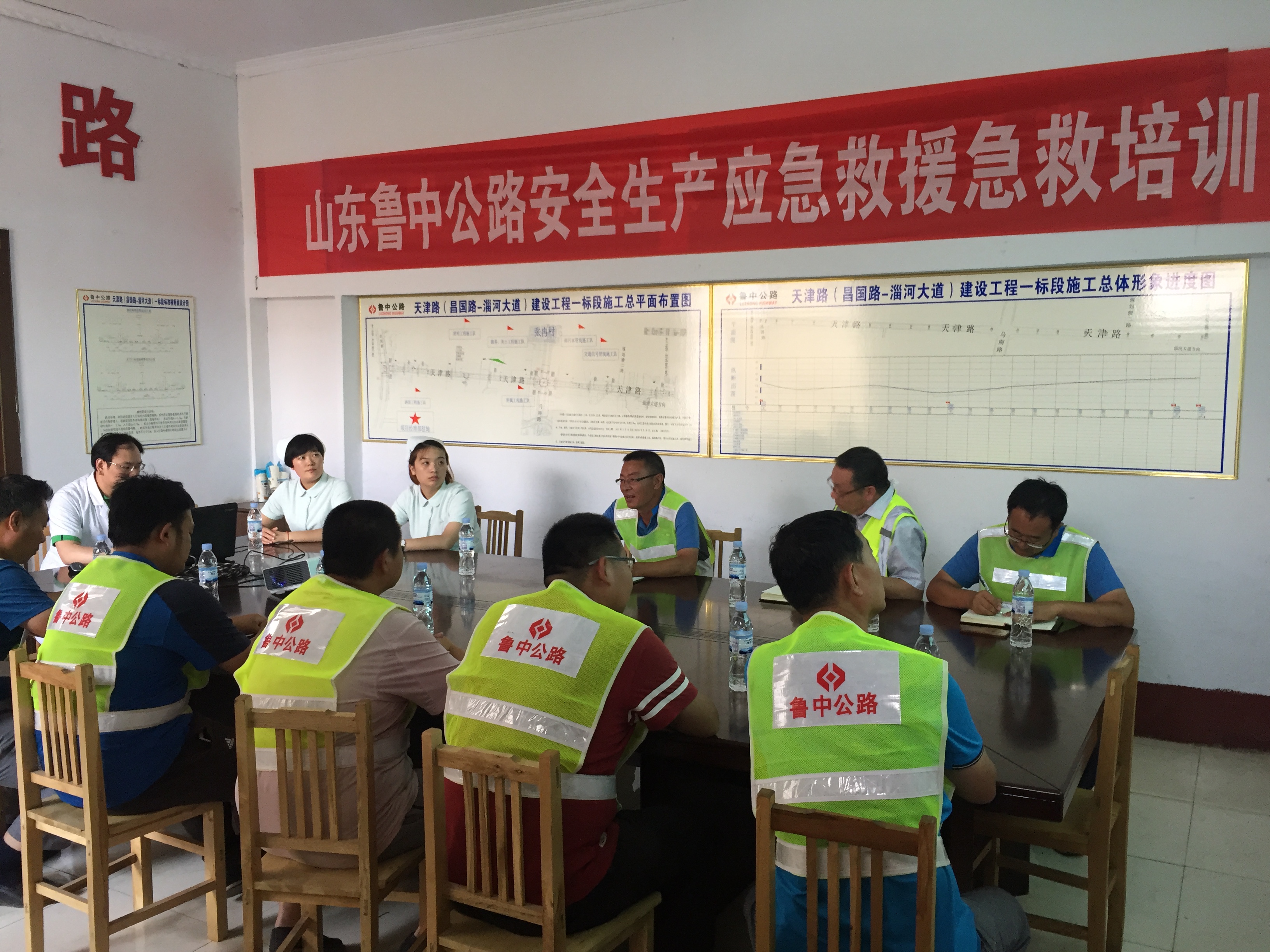 2017年6月8日下午2:00,淄博廣電醫(yī)院專業(yè)醫(yī)護(hù)人員、公司安全部人員、天津路工程項(xiàng)目部人員及施工隊(duì)負(fù)責(zé)人、一線工人代表等共計(jì)22人在項(xiàng)目部會(huì)議室進(jìn)行了生產(chǎn)應(yīng)急救援急救培訓(xùn)工作。
