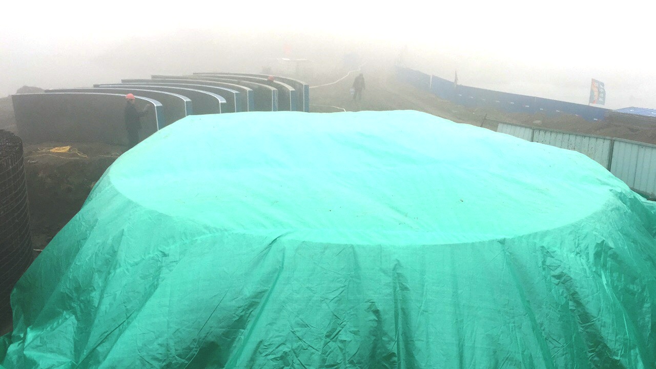 2017年2月20日,懸索橋第一節(jié)鋼主塔焊接,為保證焊接質(zhì)量,用尼龍彩條布做焊接擋風(fēng)處理。