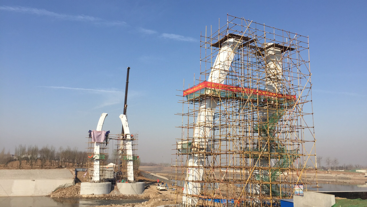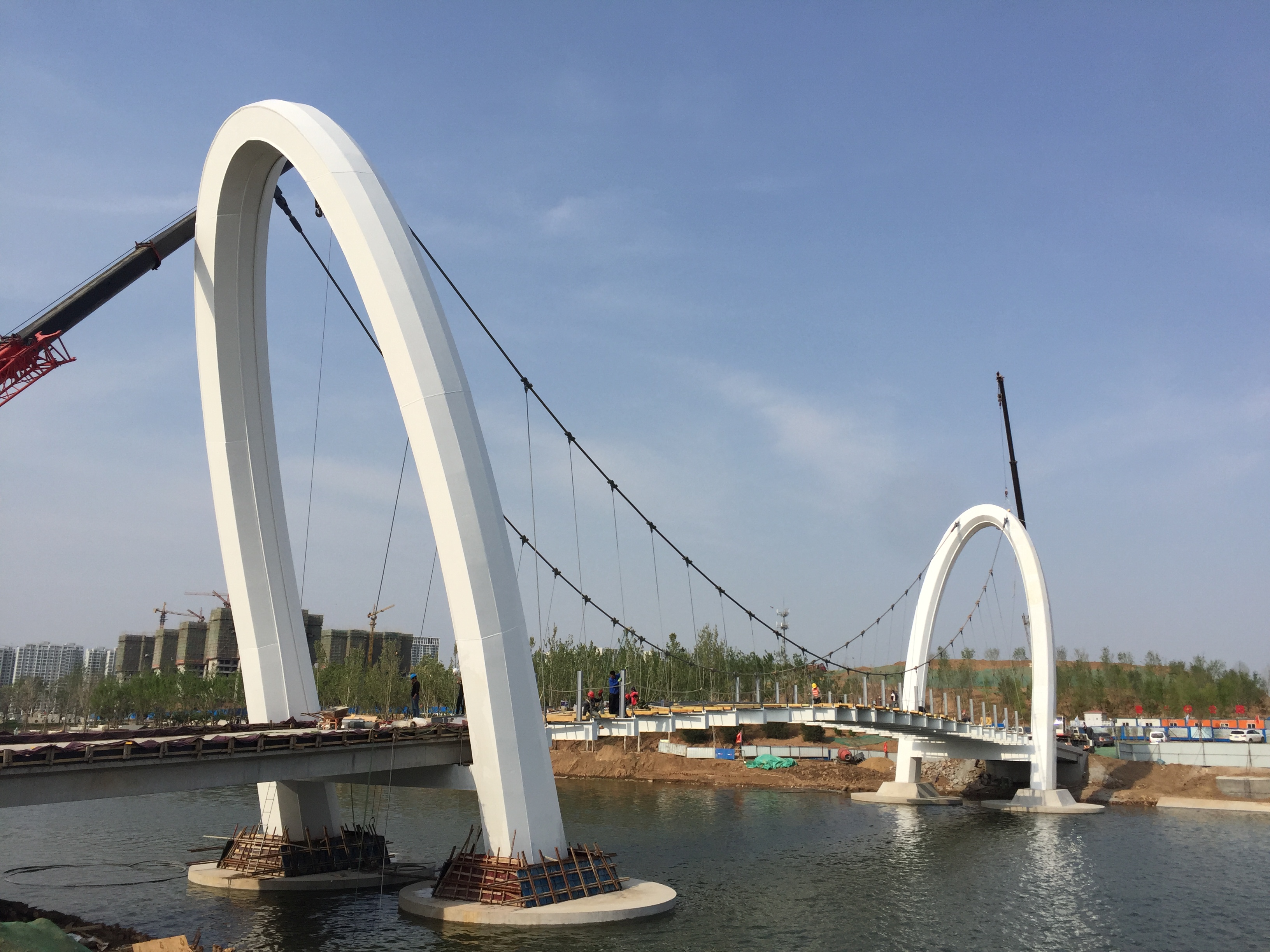 2016年9月7日,魯中公路中標(biāo)淄博市孝婦河黃土崖段綜合整治項(xiàng)目園區(qū)橋梁工程一標(biāo)段,主要施工范圍為鐵路北孝婦河橋及其配套設(shè)施。鐵路北孝婦河橋位于膠濟(jì)鐵路北側(cè)孝婦河上,結(jié)構(gòu)形式為懸索橋。主橋?yàn)榭臻g纜面懸索橋,長(zhǎng)92m,跨徑為60米,橋面寬度8m,人行道凈寬7.3m。