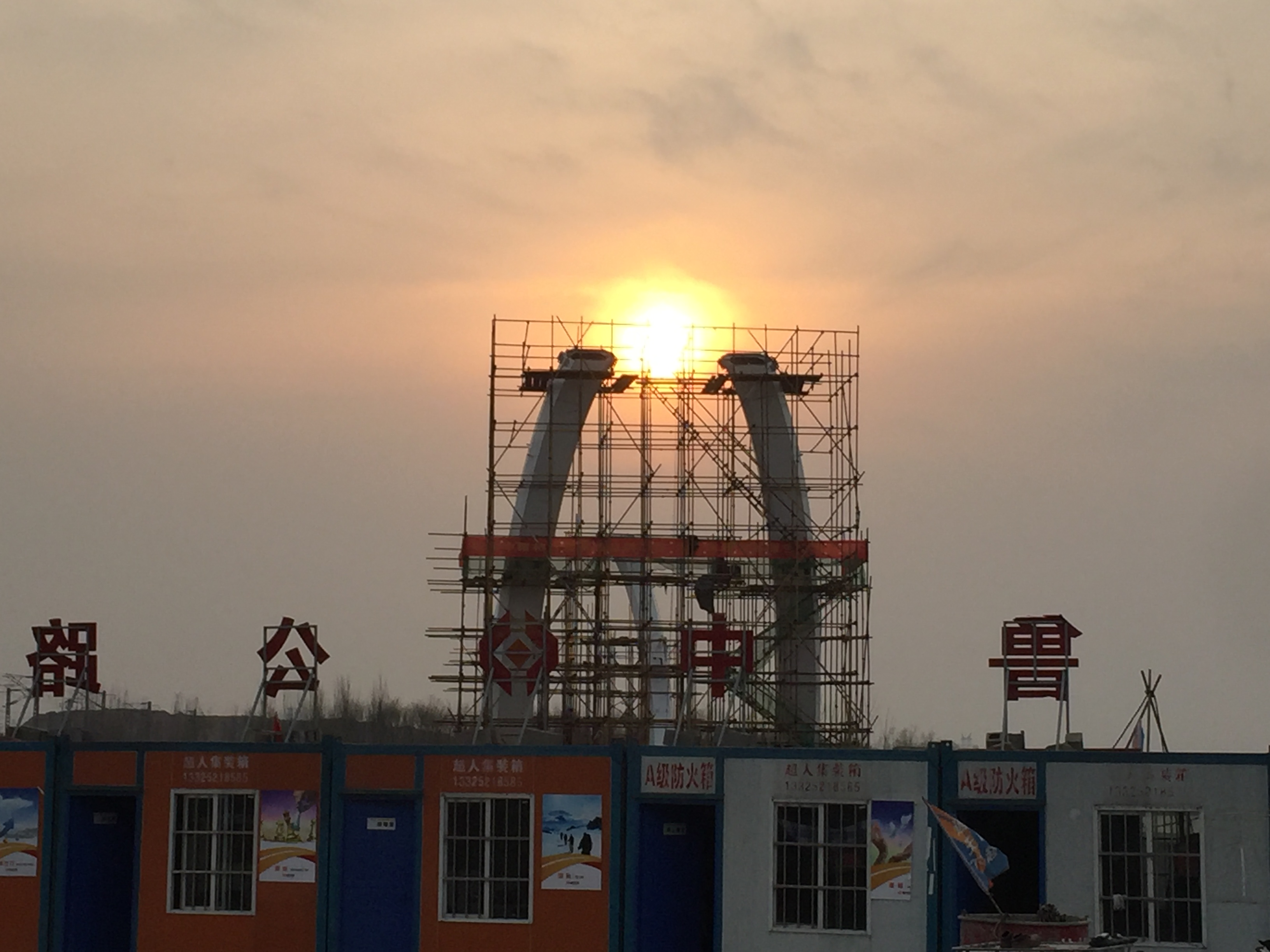 2017年3月15日,項(xiàng)目部的身后是正在崛起的懸索橋,懸索橋挺舉著金色的夕陽(yáng)。