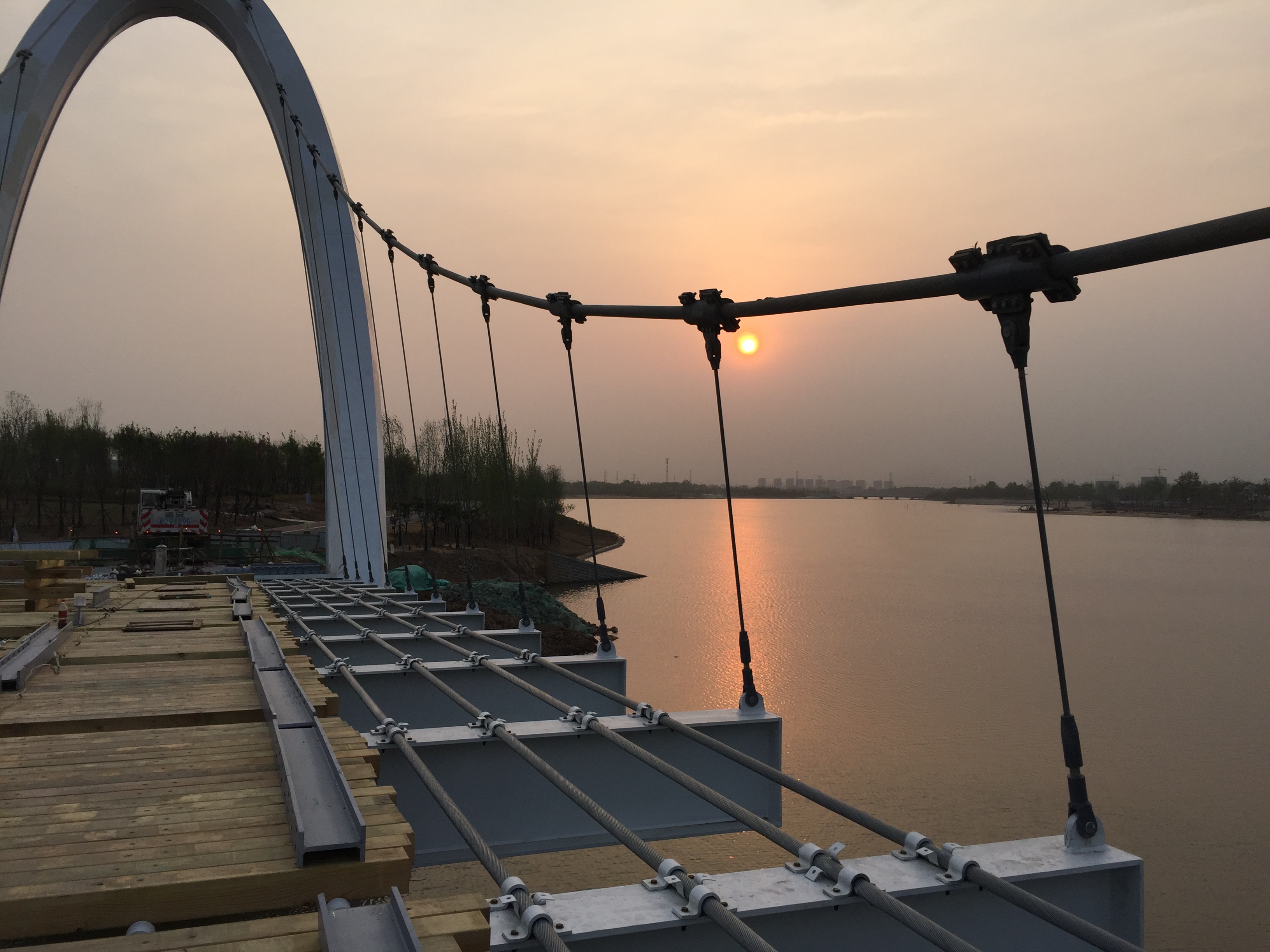 作為園區(qū)內(nèi)的景觀橋,懸索橋氣勢(shì)磅礴又婀娜飄逸,雙塔靈犀相望,橋索相連成趣,使得懸索橋極具靈動(dòng)的現(xiàn)代氣息。懸索橋是園區(qū)僅有的跨河通道,駐依纜索,迎著河面的風(fēng),腳下是碧波蕩漾的河水,極目周邊是惹人的花紅綠植,間或看到樹(shù)叢間閃現(xiàn)遠(yuǎn)處的高樓,還有偶爾的動(dòng)車(chē)從毗鄰的鐵路橋瞬間駛過(guò),現(xiàn)代的繁華中難得的幾分清淡恬然不由讓人心醉。懸索橋以它獨(dú)具匠心的設(shè)計(jì)理念、專(zhuān)業(yè)精湛的施工工藝、妥帖合適的材料元素,成為了園區(qū)一道靚麗的風(fēng)景線。