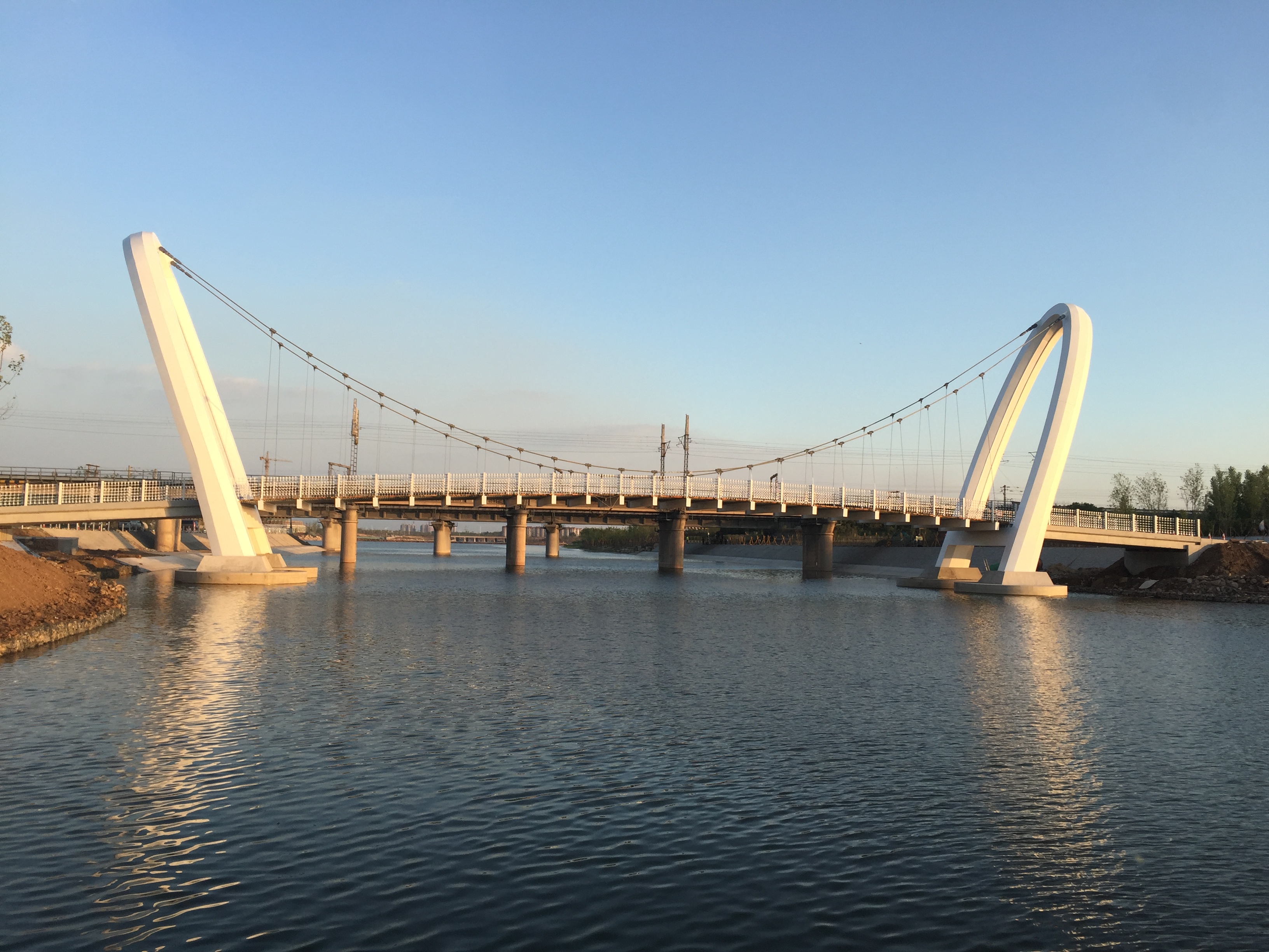 美麗的孝婦河濕地公園內(nèi)矗立著一座雄偉的白色懸索橋,它緊鄰膠濟(jì)鐵路客貨雙線橋,橫跨孝婦河?xùn)|西兩岸,遠(yuǎn)遠(yuǎn)望去猶如一條鋼鐵巨龍?jiān)陉?yáng)光下熠熠生輝。陽(yáng)光下,碧波蕩漾,懸索橋意氣風(fēng)發(fā)盤(pán)踞在水波之中;夜空中,星輝閃耀,懸索橋潔白如玉與銀河相互輝映。這就是由我山東魯中公路建設(shè)有限公司所承建的淄博市第一座鋼結(jié)構(gòu)懸索橋。