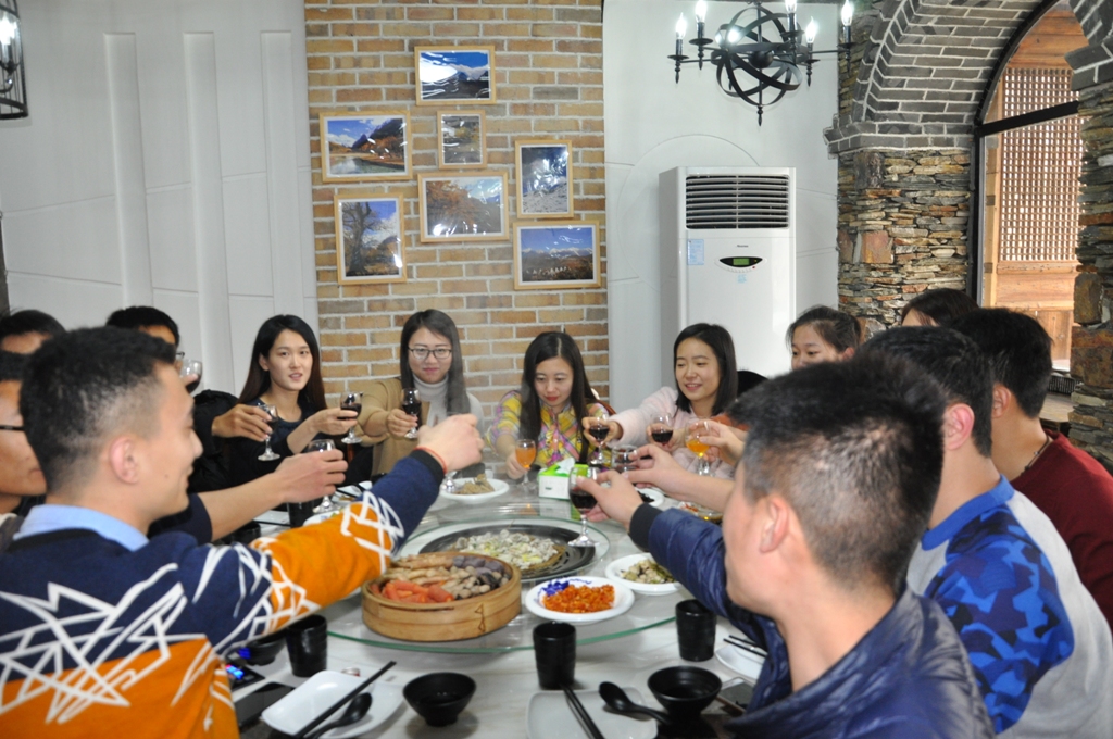 一上午的活動(dòng)充實(shí)又趣味十足。意猶未盡之中,大家離開植物園區(qū),前往獨(dú)具特色的“脆肉鯇”餐廳享用午餐。走出室外,雪花已是變大了不少,這讓大家興奮不已,一路追逐著,笑鬧著。沿途經(jīng)過布滿花燈的鵲橋,大家紛紛合影留念。進(jìn)入餐廳,美味的食物,蔓延的友誼,年青人們觥籌交錯(cuò),開懷暢談。幽默的自我介紹,興趣愛好的相互交流,團(tuán)坐在暖暖的蒸鍋周圍,一頓飯吃的是熱火朝天。