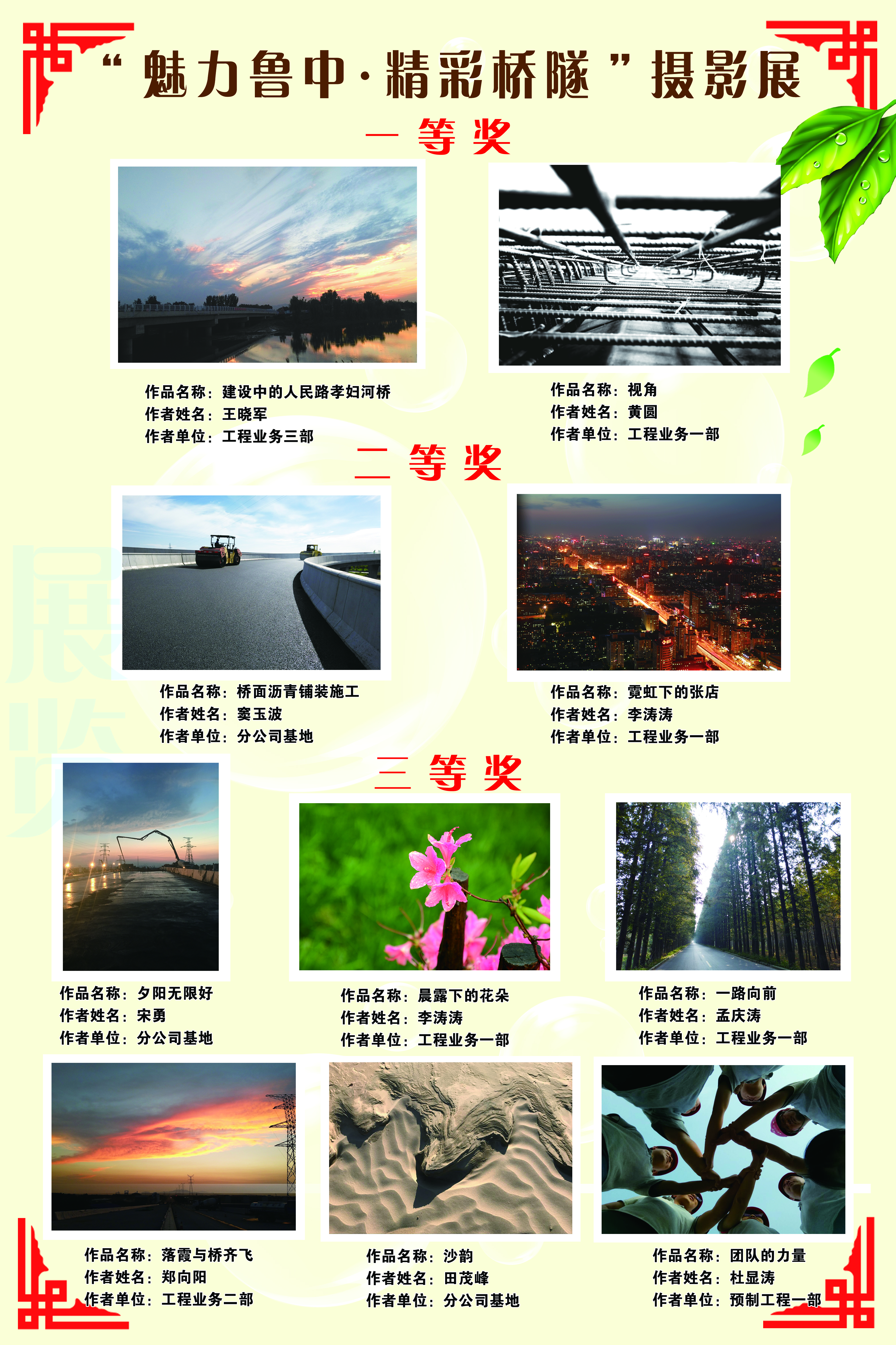 本次攝影展的主題定格為“魅力魯中,精彩橋隧”,通過攝影作品,充分體現(xiàn)了廣大職工扎根魯中公路、奉獻魯中公路的歸屬感,充分展示了橋隧分公司勇于擔(dān)當、敢為人先的責(zé)任感。攝影展共計征集到來自橋隧分公司各生產(chǎn)單位的海選作品二百余幅,經(jīng)過公司人力資源部協(xié)助聯(lián)系相關(guān)專家進行評審,評選出了一等獎2名,二等獎2名,三等獎6名,優(yōu)秀獎10名,橋隧分公司為獲獎?wù)哳C發(fā)了榮譽證書,并且分別給予了一定的物質(zhì)獎勵。