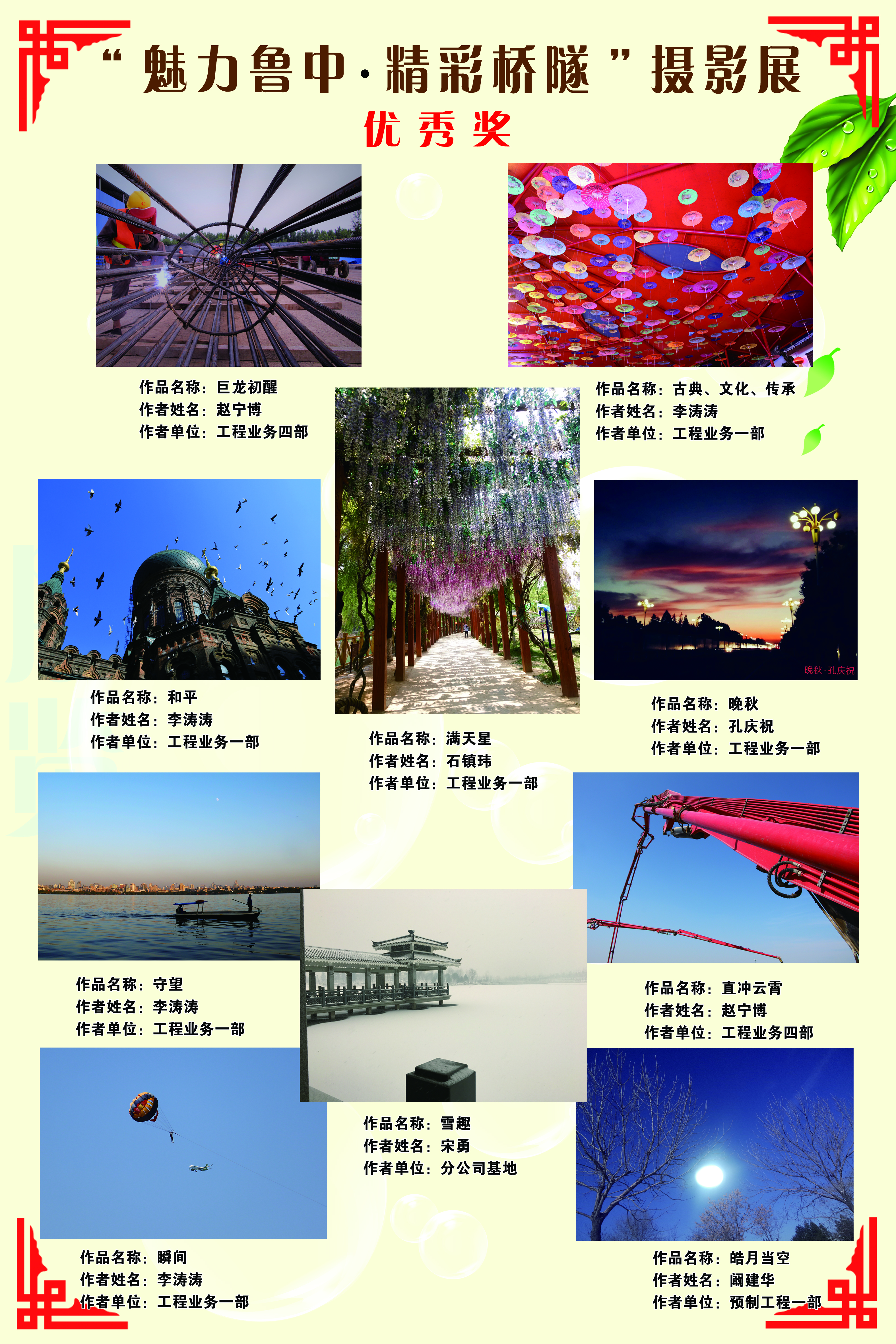 作為橋隧工程分公司2017年度“內(nèi)強管理、外樹形象”主題活動的一部分,經(jīng)過幾個月來的周密計劃、精心籌備、認真篩選、公正評判,并且在公司人力資源部的大力支持下,橋隧分公司“魅力魯中、精彩橋隧”攝影展于近日成功展出。