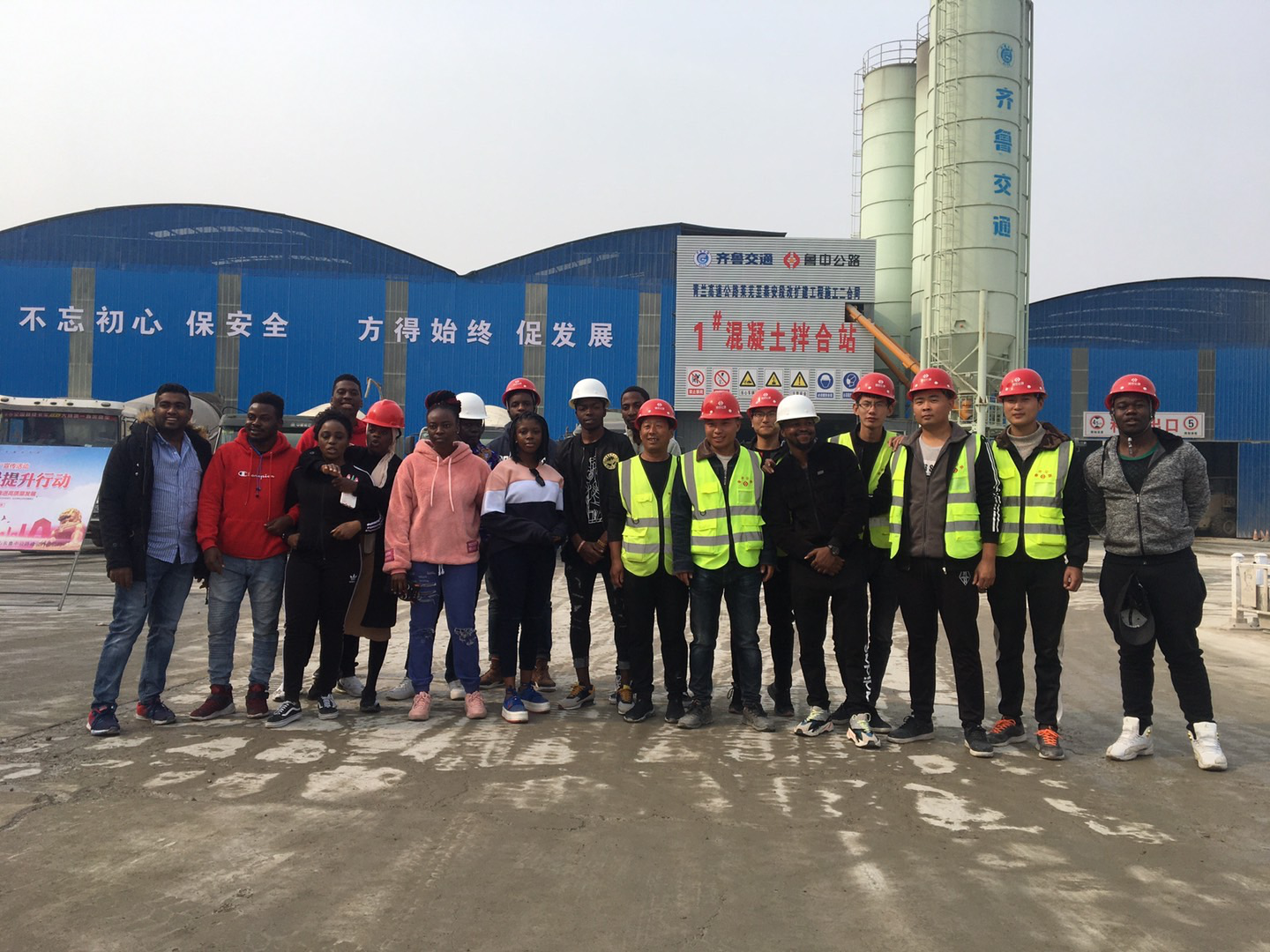 參觀結(jié)束,同學(xué)們依依不舍踏上歸程。臨行與預(yù)制場(chǎng)施工人員合影留念
