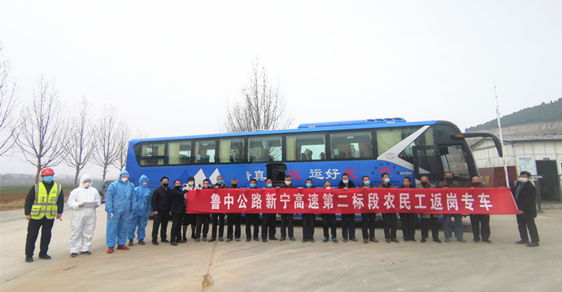 2020.02.26  張貼“魯中公路新寧高速第二標(biāo)段農(nóng)民工返崗專車”標(biāo)志的大巴車緩緩駛停二分部華豐鎮(zhèn)高莊預(yù)制場門前,標(biāo)志著新寧項目2020年攻堅戰(zhàn)正式打響。