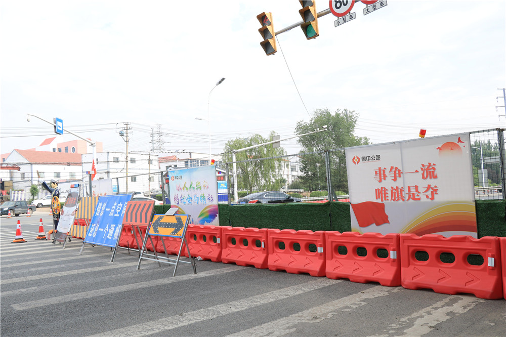 G205項目車流量大、交通形式復(fù)雜,交通組織是工程實(shí)施期間的頭等大事。項目部嚴(yán)格按規(guī)范要求布設(shè)交通封閉設(shè)施,細(xì)化交通提示牌和指示標(biāo)志,先后設(shè)置遠(yuǎn)端提示牌25塊,各類標(biāo)識標(biāo)牌近500塊,投入安全錐12000余個,水碼1000余個。項目部組成50余人的安全隊伍負(fù)責(zé)交通疏導(dǎo),確保了施工期道路安全暢通,最大限度地降低了對群眾出行的影響。自開工以來,車輛往來秩序井然,周邊群眾出入正常有序,未發(fā)生一起因道路施工引起的交通擁堵和交通事故。