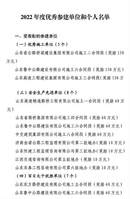 表彰內(nèi)容:臨臨項(xiàng)目六合同獲“優(yōu)秀施工單位”獎(jiǎng)勵(lì)150萬(wàn)元、“安全生產(chǎn)先進(jìn)單位”獎(jiǎng)勵(lì)60萬(wàn)元、“百日大干優(yōu)勝單位”獎(jiǎng)勵(lì)60萬(wàn)元。項(xiàng)目部李樹王等11名員工分獲優(yōu)秀工程師、安全生產(chǎn)先進(jìn)個(gè)人、征拆工作先進(jìn)個(gè)人、農(nóng)民工工資管理先進(jìn)個(gè)人、安保維穩(wěn)先進(jìn)個(gè)人稱號(hào)。