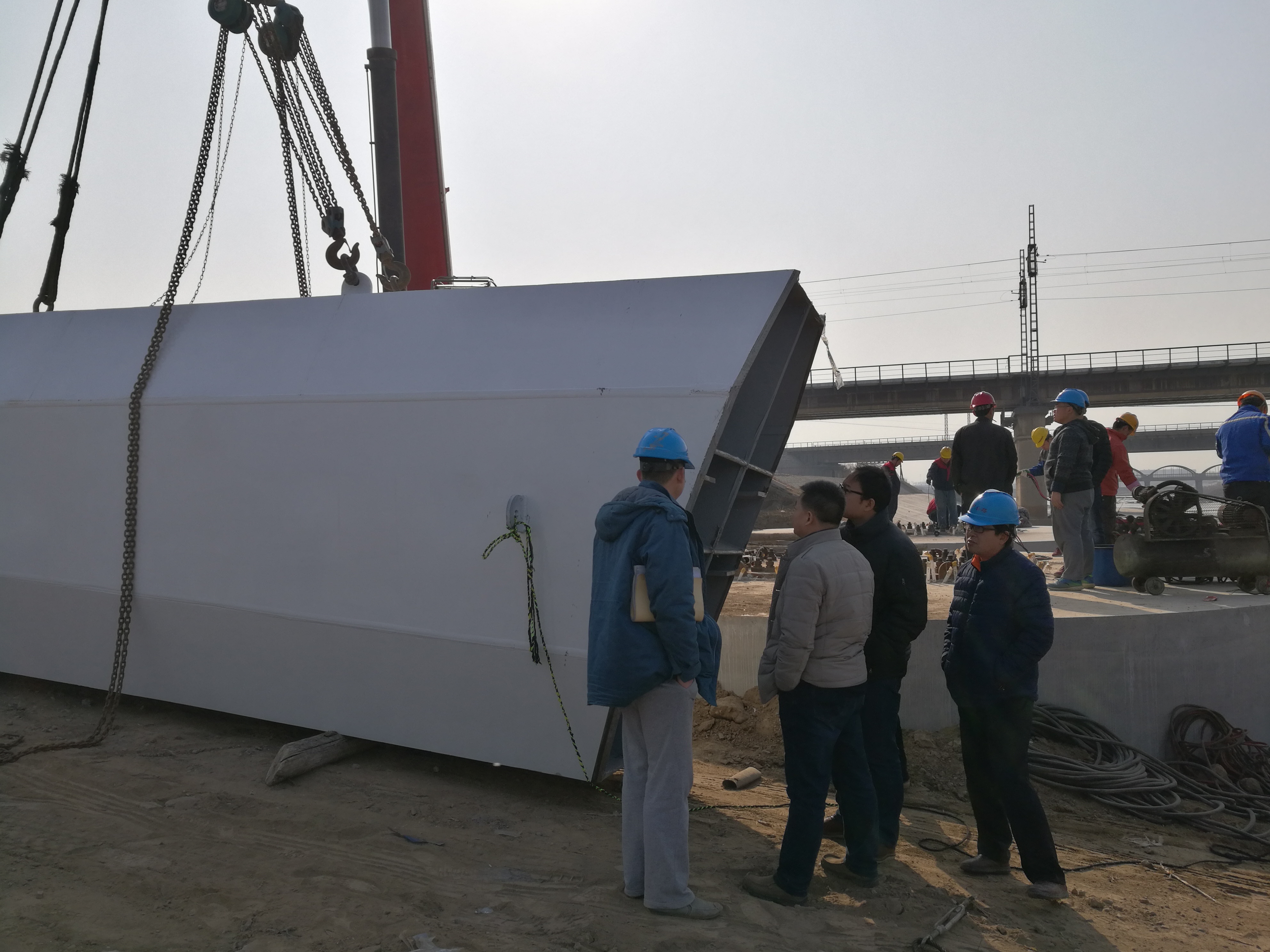 在經(jīng)過幾天緊張的準(zhǔn)備工作后,第一節(jié)主塔于2月18日順利運至現(xiàn)場。由吊車吊卸至預(yù)定地點,項目部質(zhì)檢人員會同監(jiān)理、業(yè)主方對構(gòu)件幾何尺寸、焊接質(zhì)量及外觀進行全面細(xì)致的檢測,確認(rèn)各項指標(biāo)均滿足設(shè)計及規(guī)范要求后,開始正式吊裝工作,經(jīng)過數(shù)次矯正后于下午三點十六分準(zhǔn)確吊裝到位。之后經(jīng)過三個小時的焊接,主塔脫離吊鉤,首節(jié)主塔安裝完畢。