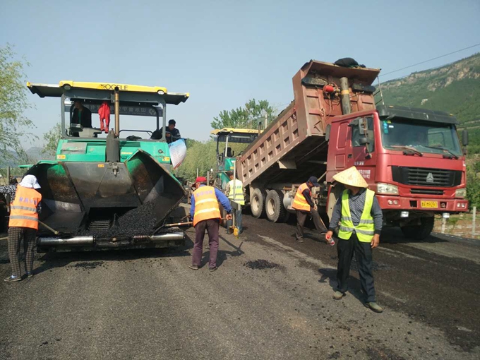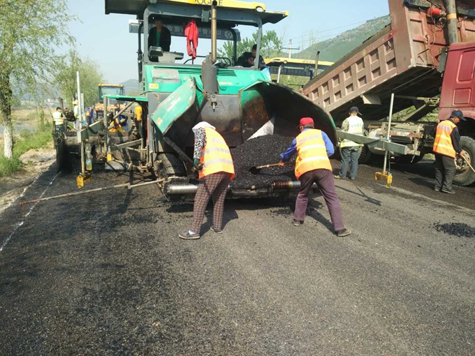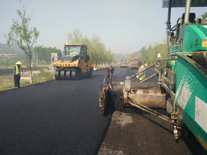 南崔路瀝青攤鋪施工現(xiàn)場(chǎng),機(jī)械設(shè)備都在忙碌的工作中。