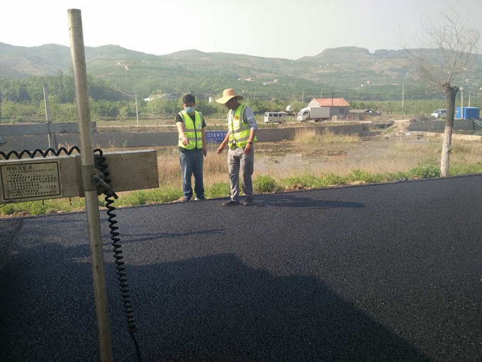 南崔路瀝青攤鋪現(xiàn)場(chǎng),施工員焦守強(qiáng)跟機(jī)檢測(cè)。