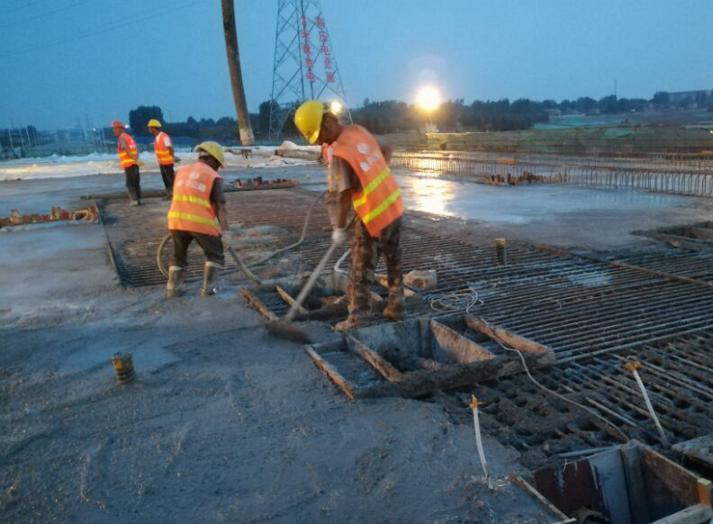 6月18日夜間,混凝土澆筑現(xiàn)場(chǎng)的施工人員忙碌的工作著