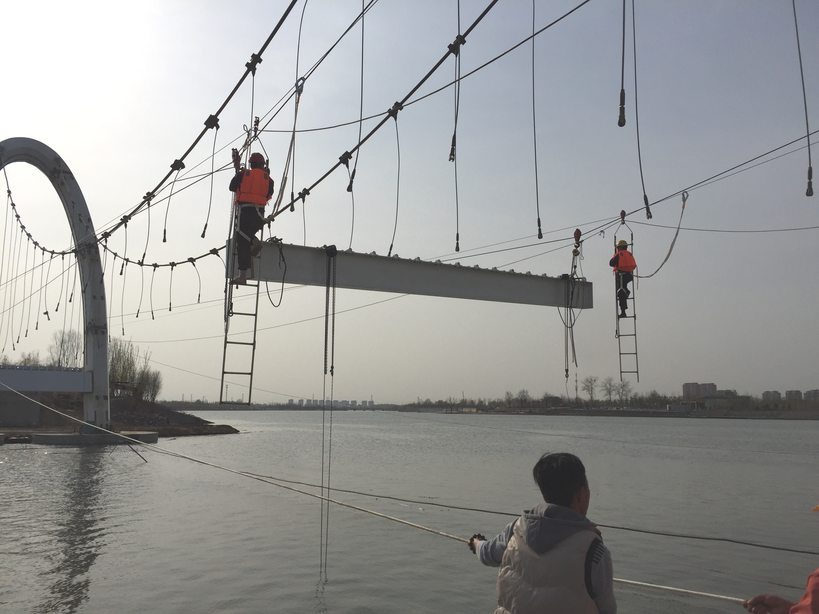 2017年4月11日,因主橋跨度較大,經(jīng)過多次實踐,最終采用輔助鋼絲繩滑道運(yùn)送至橫梁就位后再提升的辦法安裝懸索橋橫梁。