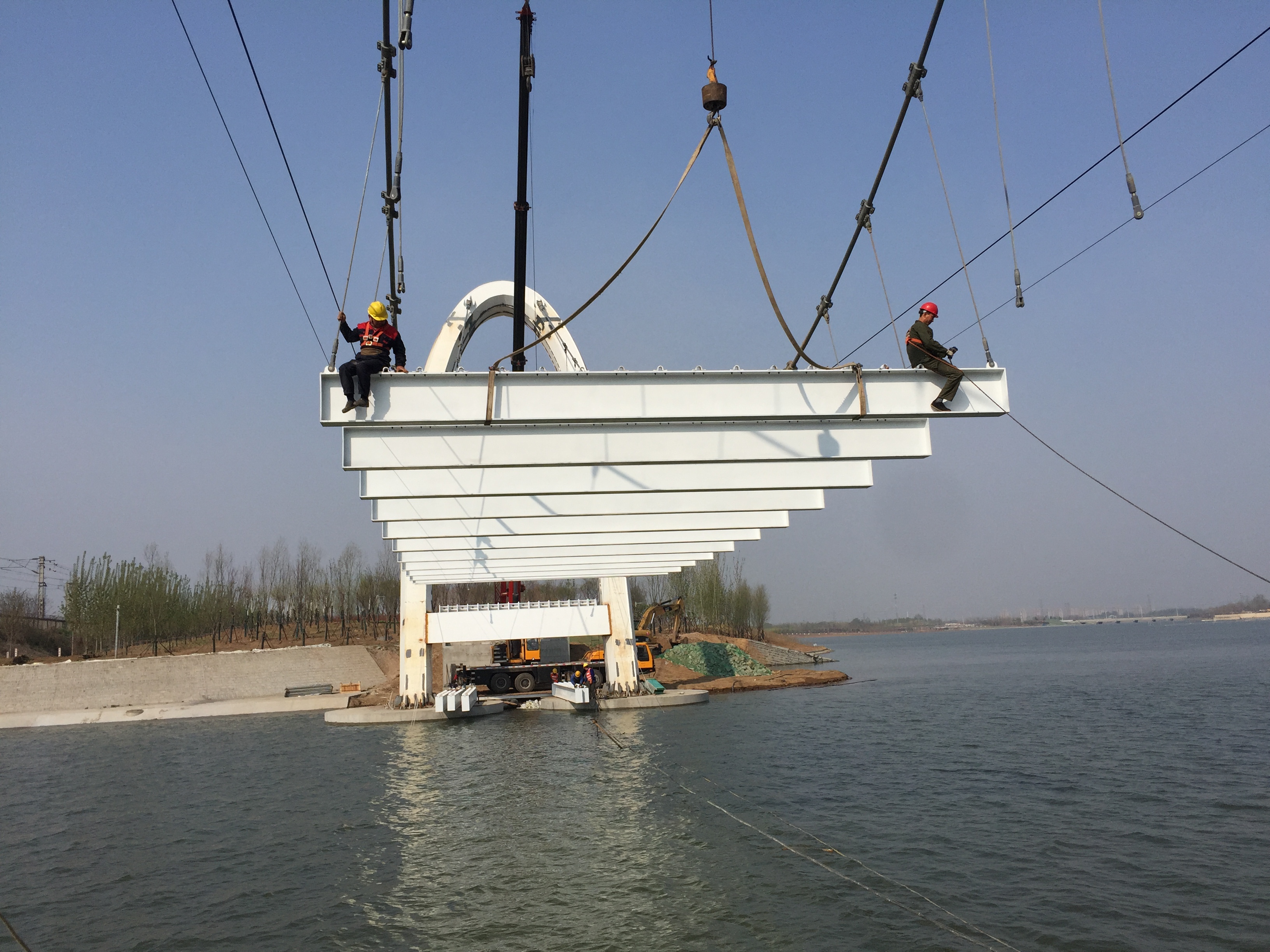 2017年2月14日,懸索橋第一節(jié)鋼主塔安裝。