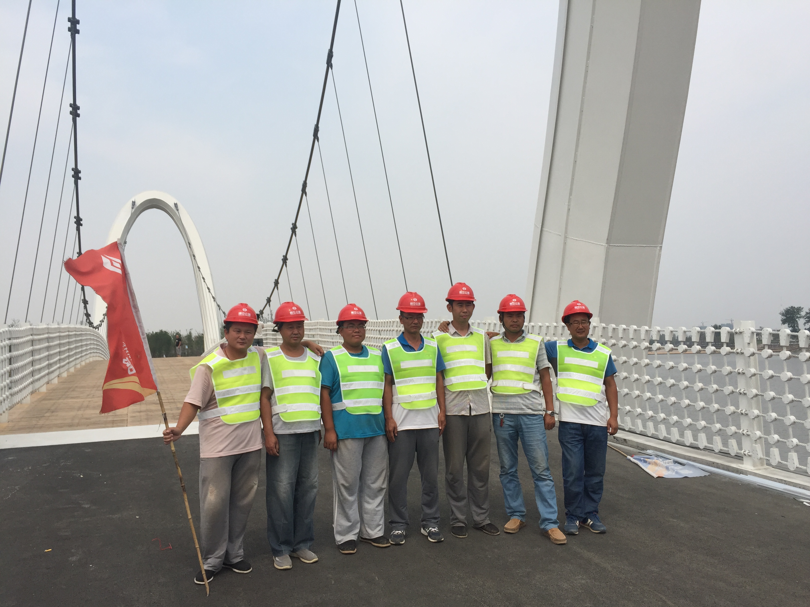 剛具雛形的大橋已經(jīng)美得惹人心醉,陽光下她白玉無瑕,夕陽中她粉魘如花,一根根鋼索,遠(yuǎn)望去,猶如珠簾般令她更加搖曳生輝。隨著工序的進(jìn)展,我們開始了橋面防腐木的鋪裝工作。1920條防腐木,護(hù)欄索30000多套不銹鋼螺絲,近6000個專門定制的異型PE件,全靠手工安裝、調(diào)整,懷揣著對懸索橋的那份執(zhí)著,大橋的建設(shè)者們采用人海戰(zhàn)術(shù)搶趕工期。近8個月的朝夕相伴,隨著護(hù)欄索的最后一道工序防銹噴漆作業(yè)的結(jié)束,懸索橋終于如期竣工了,人與橋互相見證了彼此的努力與成長,曾經(jīng)那一道道耀眼的電弧焊光,那一聲聲鋼撞鐵碰的聲響,那一車車混凝土的澆筑,成為了我們烙在心間的永恒記憶。