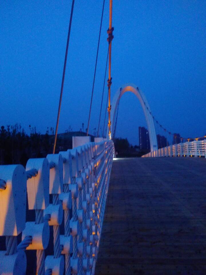 美麗的孝婦河濕地公園內(nèi)矗立著一座雄偉的白色懸索橋,它緊鄰膠濟(jì)鐵路客貨雙線橋,橫跨孝婦河?xùn)|西兩岸,遠(yuǎn)遠(yuǎn)望去猶如一條鋼鐵巨龍在陽光下熠熠生輝。陽光下,碧波蕩漾,懸索橋意氣風(fēng)發(fā)盤踞在水波之中;夜空中,星輝閃耀,懸索橋潔白如玉與銀河相互輝映。這就是由我山東魯中公路建設(shè)有限公司所承建的淄博市第一座鋼結(jié)構(gòu)懸索橋。