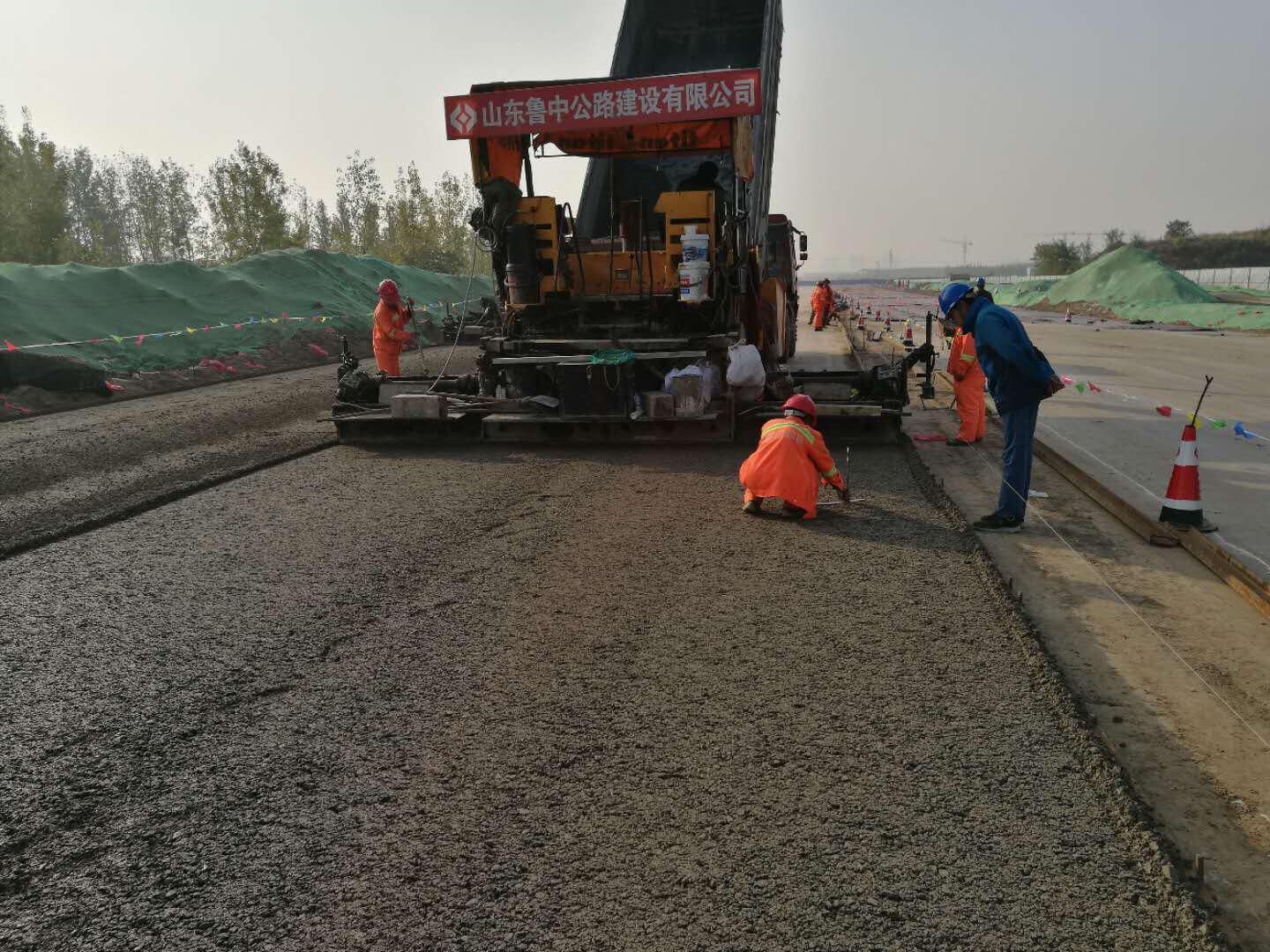 高鐵新城站東路水泥穩(wěn)定碎石基層試驗(yàn)段成功攤鋪