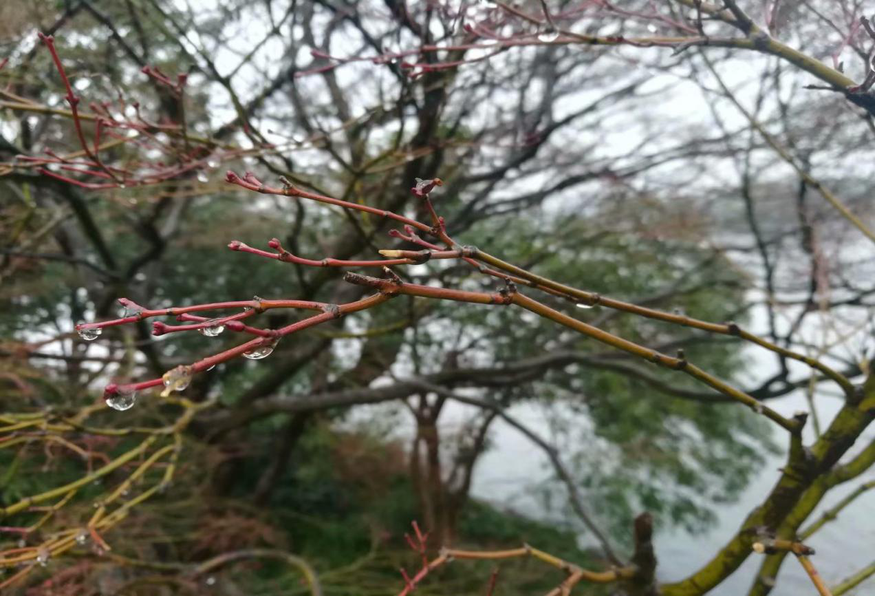 你看,在這溫暖的江南,也是會有一些花草樹木凋零,以他們自己的方式表達著對這四季輪回的尊重。雨后的枝丫總掛著一些調(diào)皮的水滴,不肯落下,沒了葉片的樹枝有著簡單的線條,再有這水珠的靈動,也讓人甚是喜歡。