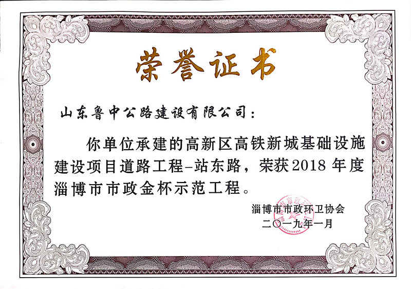2019年1月,淄博市市政環(huán)衛(wèi)協(xié)會(huì)授予魯中公路2018年度“淄博市優(yōu)秀市政施工企業(yè)”、“淄博市市政工程質(zhì)量管理先進(jìn)企業(yè)”榮譽(yù)稱號(hào)