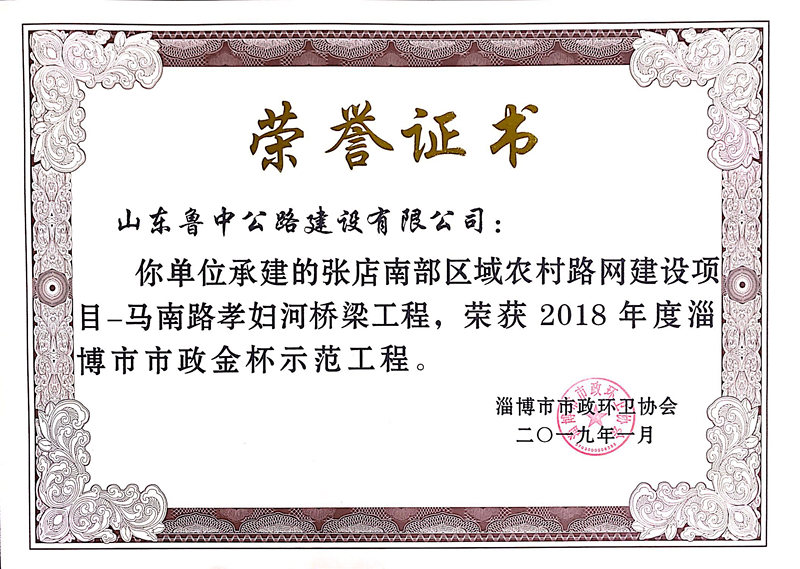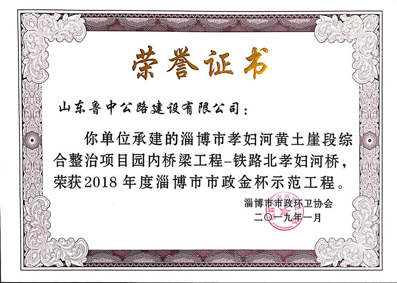 2019年1月,淄博市市政環(huán)衛(wèi)協(xié)會(huì)授予魯中公路承建的馬南路孝婦河橋梁工程、孝婦河懸索橋工程等四項(xiàng)工程市級(jí)“市政金杯示范工程”榮譽(yù)稱號(hào)