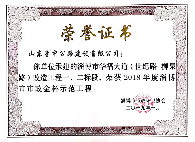 2019年1月,淄博市環(huán)衛(wèi)處授予魯中公路承建的華福大道改造工程施工一標(biāo)段等四項(xiàng)工程市級(jí)“市政工程安全文明工地”榮譽(yù)稱號(hào)