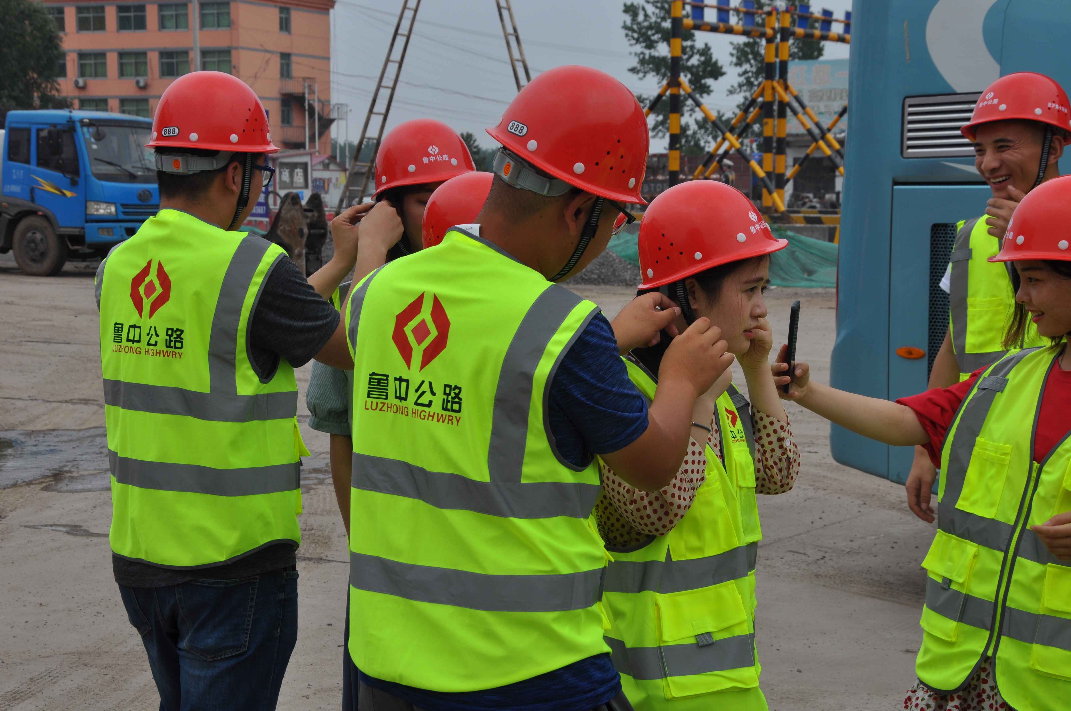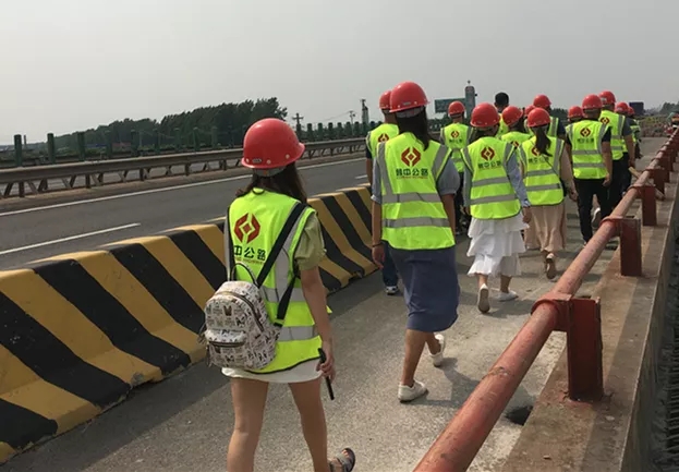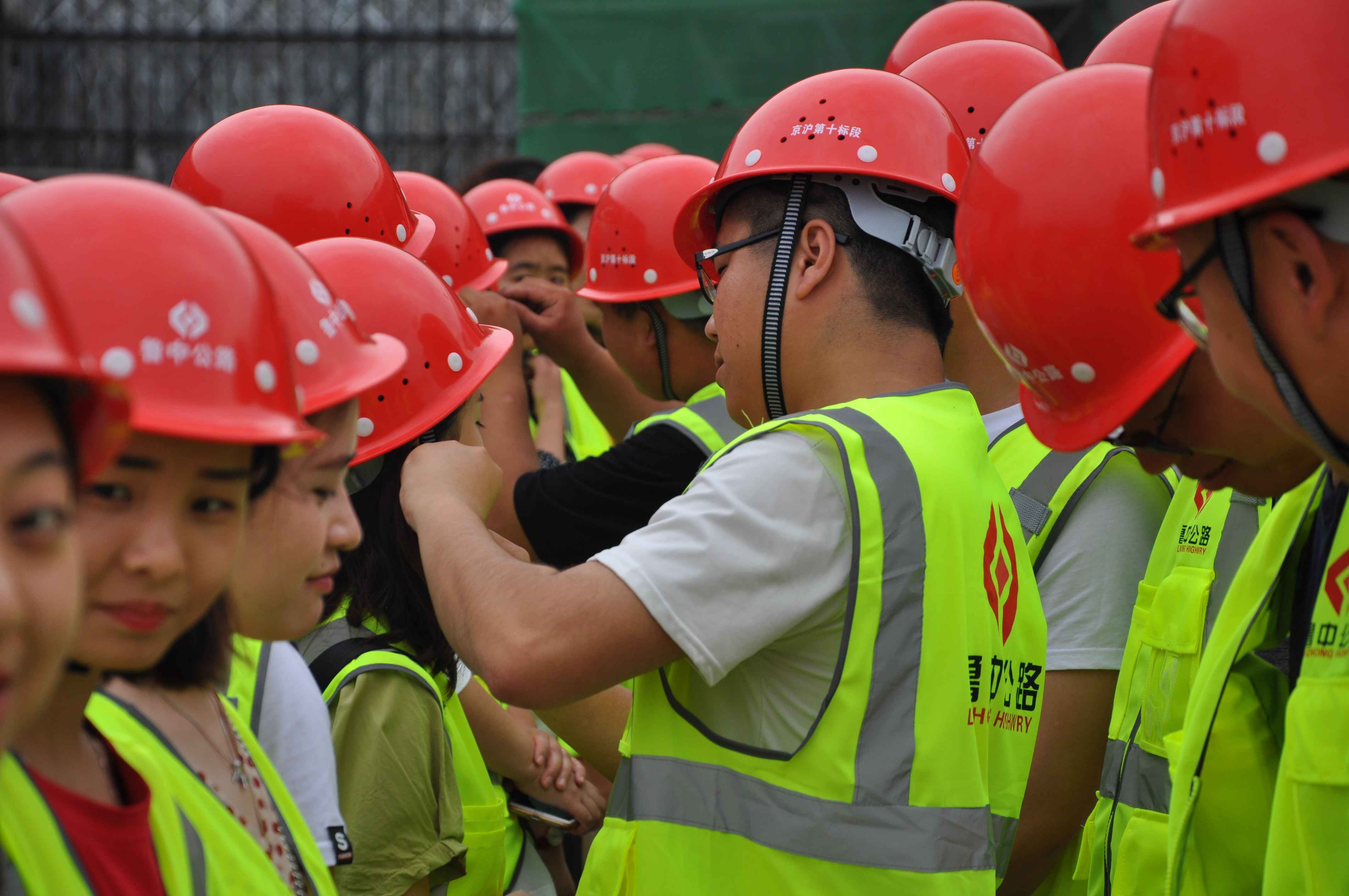 參觀完項(xiàng)目部,一行人再次登上大巴車,前往G2紅花埠主線橋施工現(xiàn)場(chǎng),小伙子為小姑娘們戴好安全帽、穿好反光衣