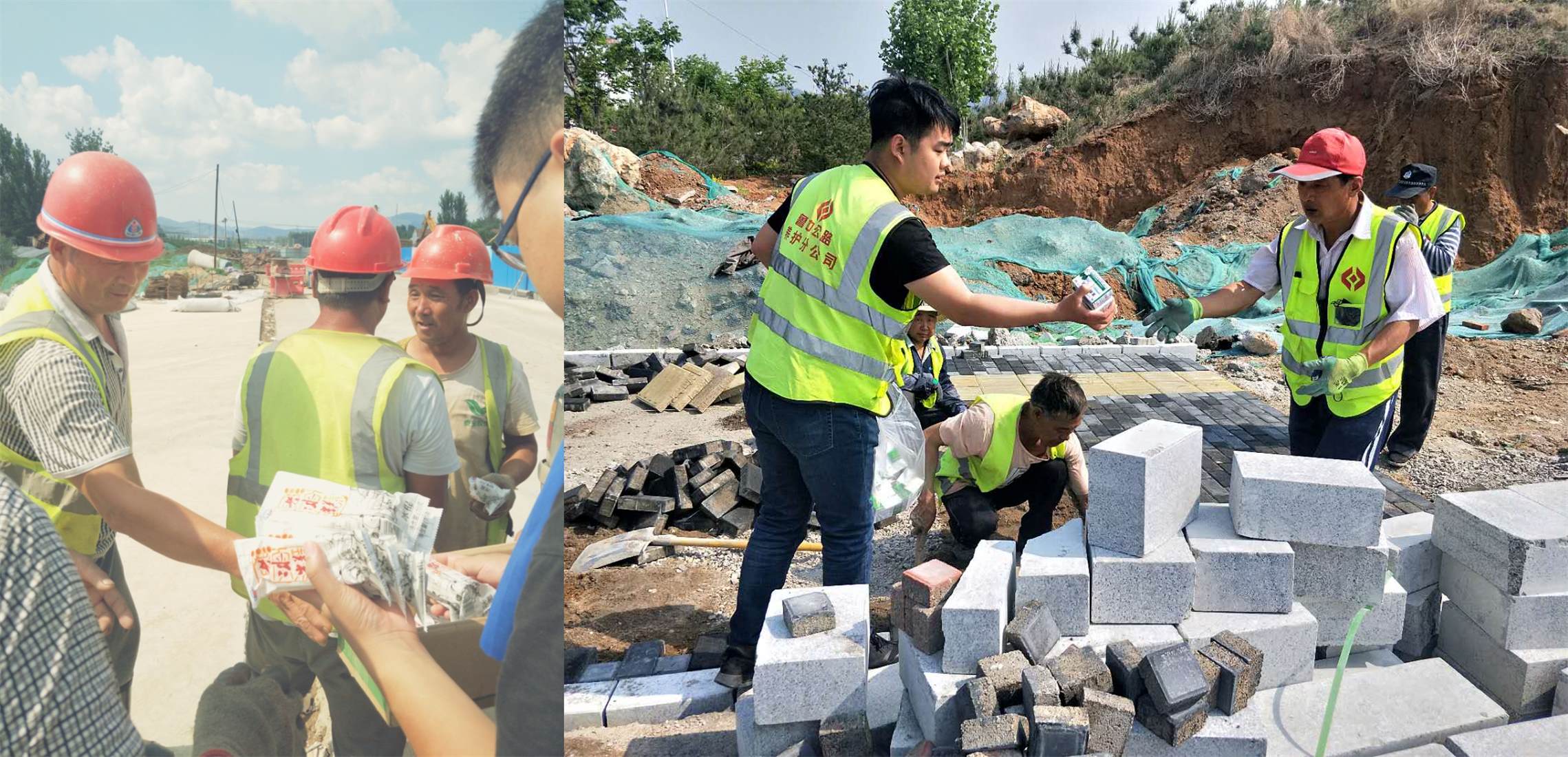 沂源縣人民路是2017年市重大項(xiàng)目,沂源縣重點(diǎn)工程,起點(diǎn)為魚臺大橋,終點(diǎn)為振興東路,全長8.64公里,工期截止到7月底,時(shí)間緊、任務(wù)重,人民路全體職工合理安排工期、人員、加班加點(diǎn)進(jìn)行施工,晚上延時(shí)到22點(diǎn),早上不到7點(diǎn)就必須趕赴施工現(xiàn)場。實(shí)在熱得受不了了,小伙子們就喝上瓶藿香正氣水,休息片刻,繼續(xù)堅(jiān)持工作。