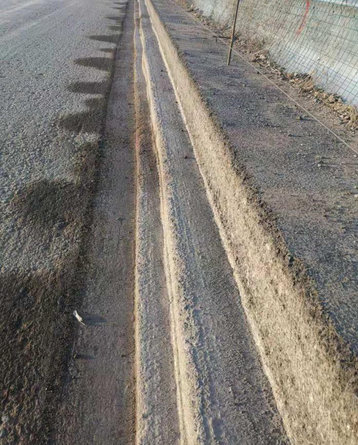 由于改裝的銑刨機是在右后方增加一個銑刨鼓,所以銑刨機的重心轉(zhuǎn)移到右后輪,在調(diào)轉(zhuǎn)的過程中,左幅大部分上坡道不是無法承重,就是寬度不足,導(dǎo)致每次調(diào)轉(zhuǎn)都是一個大問題。后來想著從橋面上通過,于是利用銑刨老路臺階的銑刨料墊路,有壓路機壓實,當?shù)谝淮螐臉蛎嫔贤ㄟ^時,心情無比的激動,因此銑刨工作大大提高了效率?,F(xiàn)在導(dǎo)改之后,右幅是在老路路面上銑刨,沒有了左幅的那些困難,銑刨出來的順直度也比左幅好一些,這就是銑刨臺階的故事。