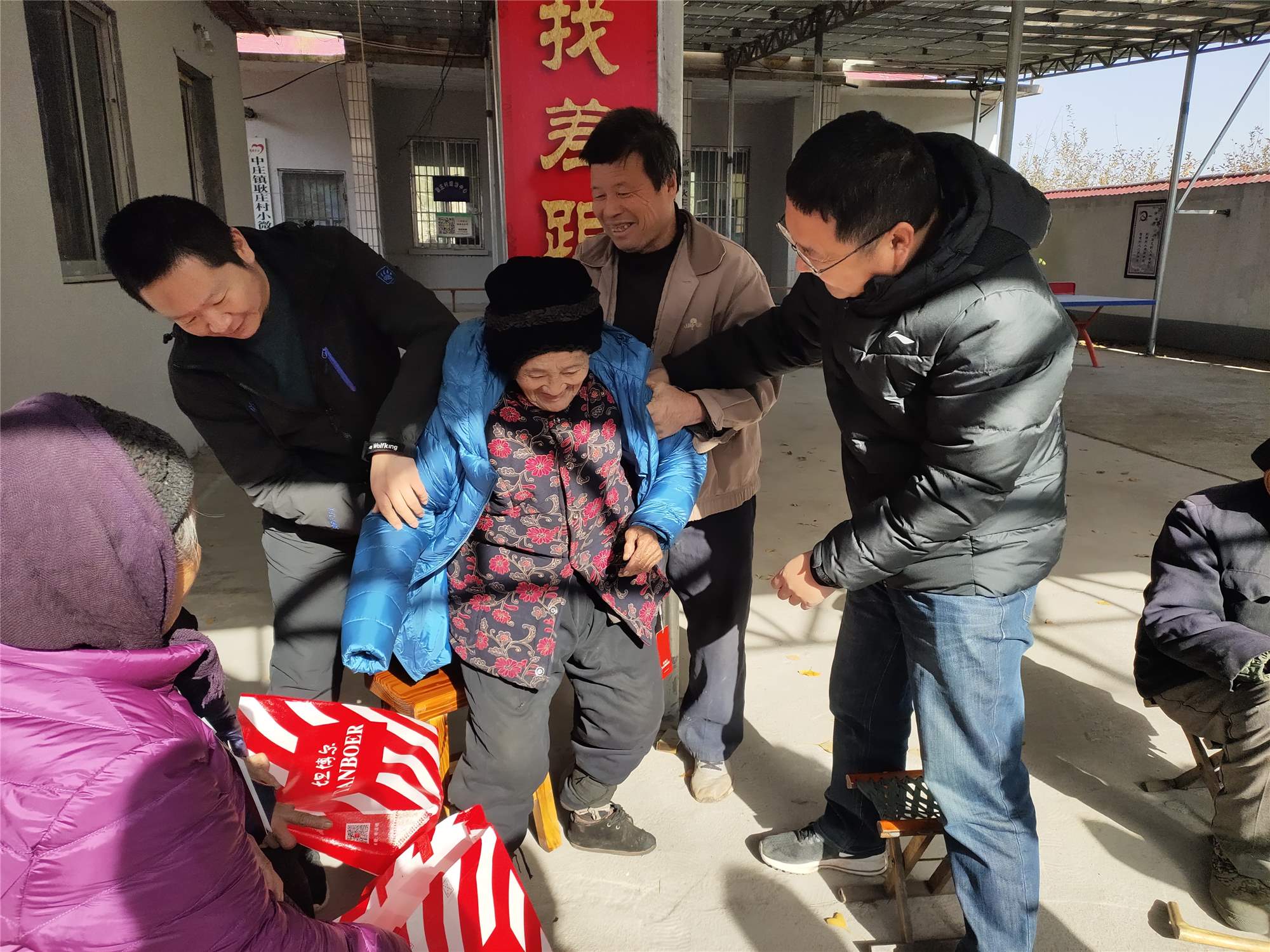 養(yǎng)護(hù)工程分公司黨支部書(shū)記黃衍剛、項(xiàng)目經(jīng)理王峰為村中最高壽(96歲)老人換上新衣