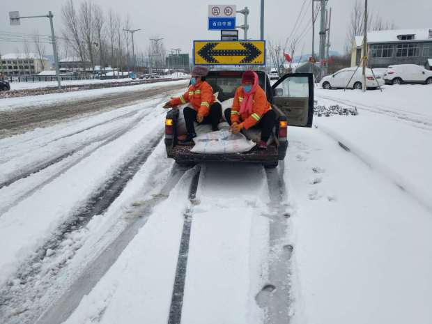在沂源縣人民路項目部隔離的我們?yōu)榱私煌ò踩殖伤慕M對沂源縣人民路進行除雪作業(yè)。首先出門前對人員進行了分工和安全交底,每個人必須戴口罩、消毒、穿反光衣和注意保暖。兩組人員負責對路面撒融雪劑,一組人員進行安全巡視,一組人員負責對大平交路口進行除雪。由于疫情原因路上車流量較少,加快了我們除雪的速度。在雪白的道路上我們的反光衣顯得格外耀眼,在寒風中浴“雪”奮戰(zhàn),奮力的鏟除路上的積雪。大家干得熱火朝天,身上都冒汗了,腳上的鞋也濕透了,為了保障市民出行方便、安全,他們顧不得這些,不間斷地清掃著。