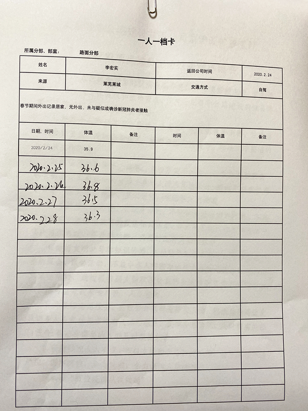 實行進(jìn)場人員“一人一檔”制度,體溫動態(tài)管理