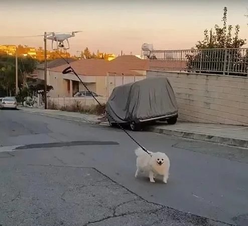 遛狗的大疆四旋翼無(wú)人機(jī)