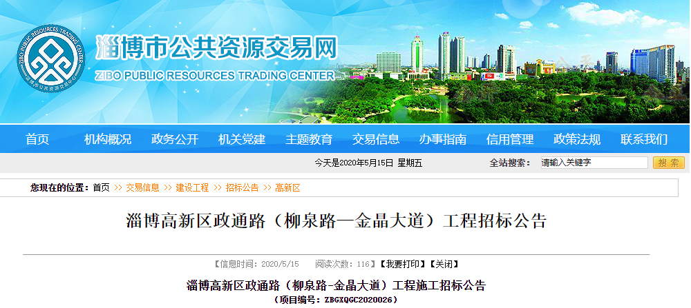 淄博高新區(qū)政通路(柳泉路-金晶大道)工程施工招標(biāo)公告