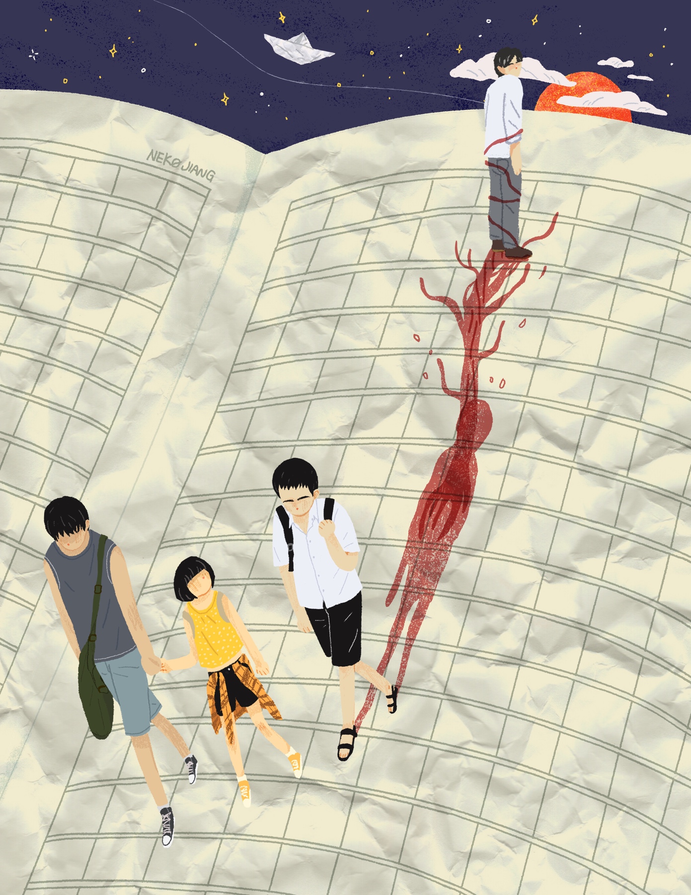 小說開篇即是張東升在妻子出軌決議離婚之后,在隱忍了一年,計(jì)劃了一年時(shí),毫不猶豫的將自己的岳父母從山上推了下去。本來這會(huì)是一場完美犯罪,缺意外的被三個(gè)游玩的小孩子錄到了視頻中。朱朝陽本想報(bào)警,卻被普普阻止,她想勒索張東升,用勒索到的錢和丁浩成長到成年。在這時(shí),朱朝陽還是一個(gè)規(guī)規(guī)矩矩的乖孩子,轉(zhuǎn)折點(diǎn)發(fā)生在意外殺死朱晶晶之后。為避免其他兩個(gè)人將他殺人的事情說出去,只能同意勒索之事,這是朱朝陽邁向黑暗的第一步,之后的事情更加不受控制:要挾張東升將自己父親和后媽殺害;為盡早繼承遺產(chǎn)挖出尸體的一角;在明知道張東升要?dú)⑺雷约汉突锇槿藭r(shí),袖手旁觀,最終獨(dú)自存活。推動(dòng)所有事件的朱朝陽,卻在最后憑借一本“長高秘籍”和編造的日記本逃脫嫌疑,不得不敬佩這位少年的心智之高。