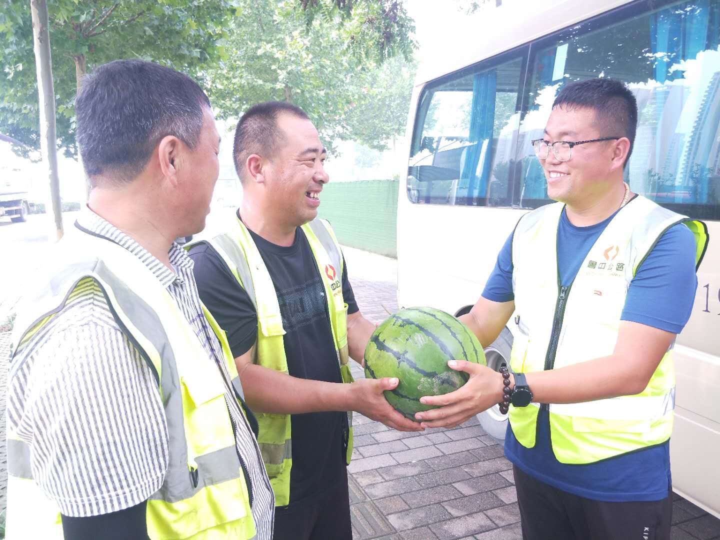 八月如火,赤日炎炎,進(jìn)入了中伏天,更是熱浪逼人。筑路工人們頂著烈日、冒著酷暑忙著在路面攤鋪瀝青混凝土。鋪了瀝青的地表溫度達(dá)到140℃以上,滾燙的瀝青騰起嗆人的煙霧。為有效預(yù)防高溫天氣中暑,藿香正氣水、西瓜、礦泉水等都是最佳的防暑降溫物品。“來來來,天氣炎熱,大家吃點(diǎn)西瓜、喝口礦泉水。”聯(lián)通路瀝青施工現(xiàn)場(chǎng)支部黨員從車上搬出西瓜和解暑飲品。“天太熱,辛苦了,喝口水吧”市政黨小組黨員給場(chǎng)站崗位送來礦泉水。“這大熱天,還堅(jiān)守在崗位上,太辛苦了,吃塊西瓜解解暑”博山路面黨小組給各工地送去一絲清涼。青蘭高速路面項(xiàng)目與黨支部共同把高溫慰問品送到施工一線,把貼心關(guān)愛送到職工手中。送完防暑降溫用品,再吃上一口西瓜,一線群眾直呼“過癮”。在工友們看來,作為基層黨組織,公司黨支部黨員此番送來的是“涼意”,讓他們心里感覺爽爽的。