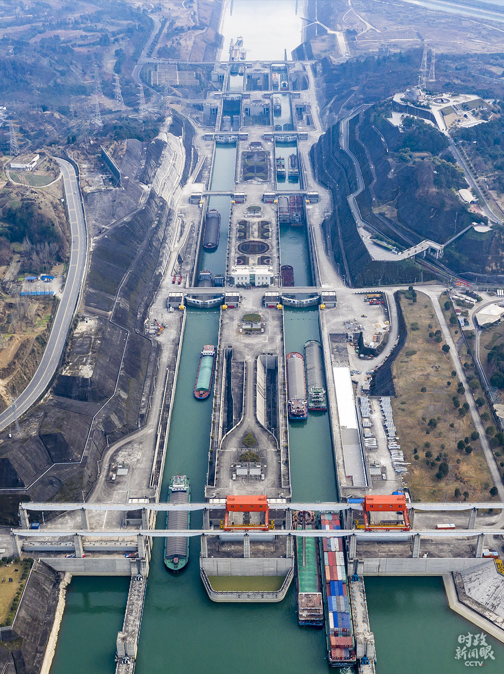 2021年1月10日,湖北宜昌,船舶有序行駛在三峽五級(jí)船閘。