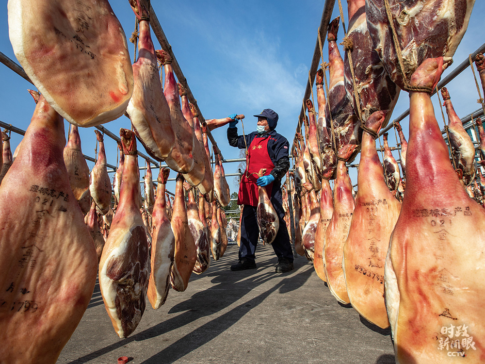 2021年1月10日,浙江金華某火腿加工區(qū)整整齊齊吊曬著上萬(wàn)只火腿。