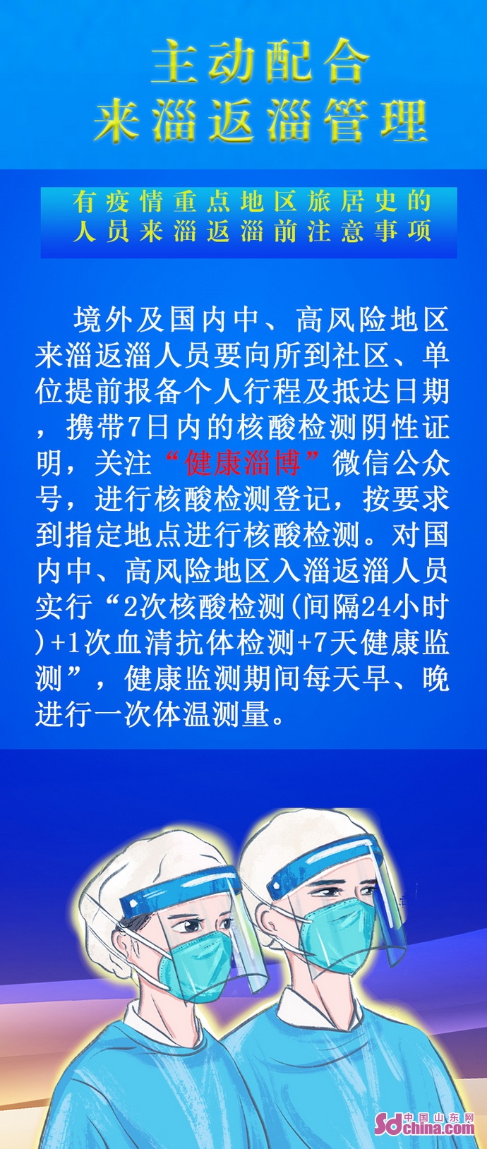 來淄返淄人員應積極響應疫情防控要求,境外及國內(nèi)中、高風險地區(qū)來淄返淄人員須提前向所到社區(qū)(村居)和單位如實報告行程。攜帶7日內(nèi)核酸檢測陰性證明,關注“健康淄博”公眾號,進行核酸檢測登記,并按要求到指定地點進行核酸檢測。國內(nèi)中、高風險地區(qū)來淄返淄人員務必做到“2次核酸檢測(間隔24小時)+1次血清抗體檢測+7天健康監(jiān)測”,健康監(jiān)測期間配合社區(qū)(村居)人員每天早、晚監(jiān)測一次體溫。