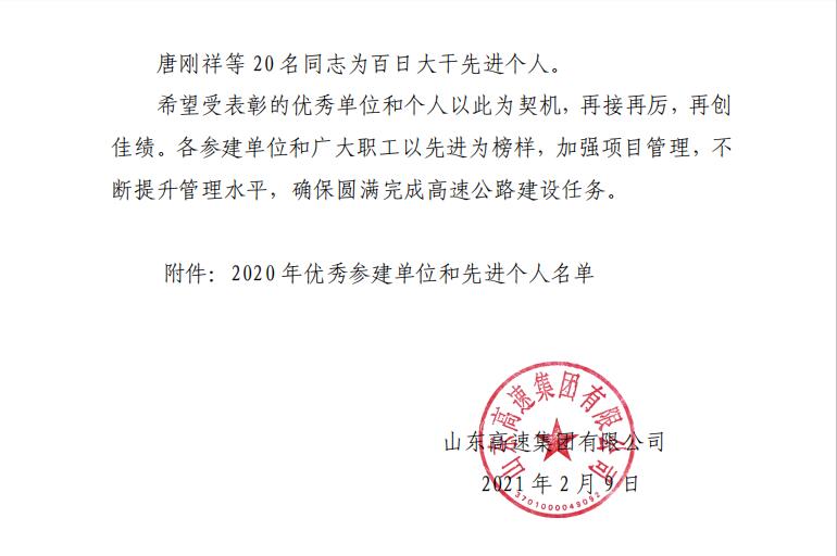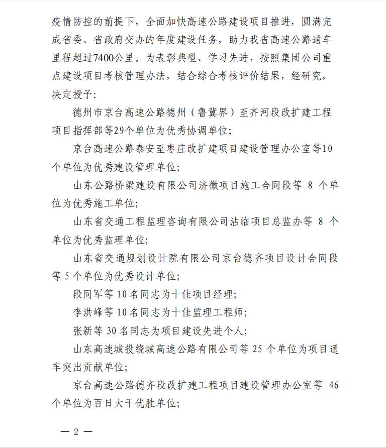 近日,由山東高速集團(tuán)有限公司舉辦的2020年度“戰(zhàn)保比”勞動(dòng)競(jìng)賽結(jié)果揭曉,我公司喜獲“項(xiàng)目通車突出貢獻(xiàn)單位”、“百日大干優(yōu)勝單位”榮譽(yù)稱號(hào)。