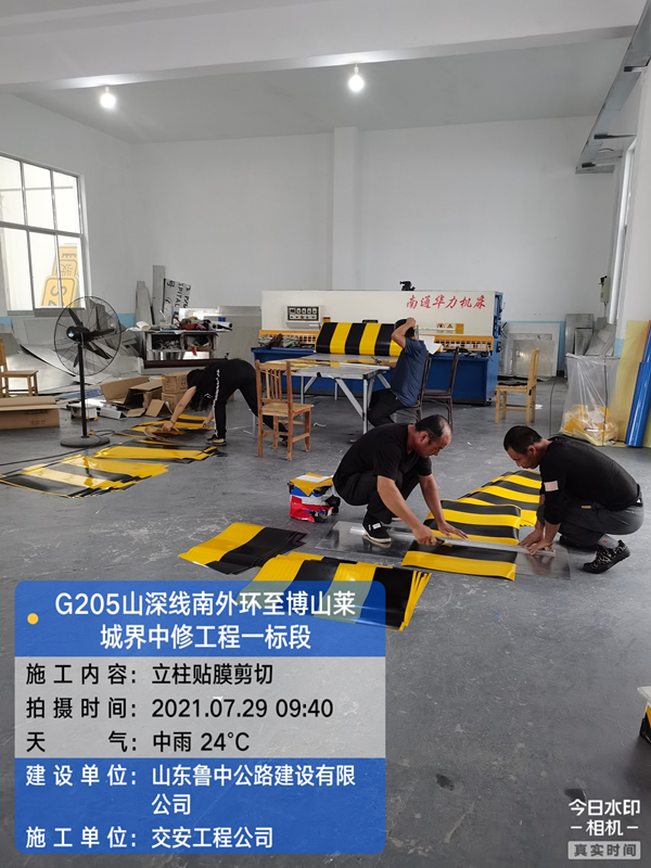 標(biāo)志牌施工分部充分利用因臺風(fēng)不能現(xiàn)場安裝的空余時間,在車間內(nèi)加工反光膜及標(biāo)志牌,爭分奪秒與時間賽跑。