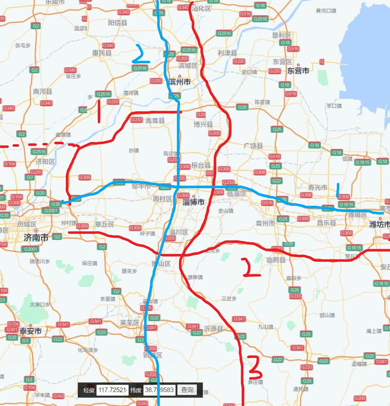 一豎是濱萊高速 已經(jīng)八車(chē)道改造,縱穿淄博境內(nèi),是一條非常重要的南北大通道。